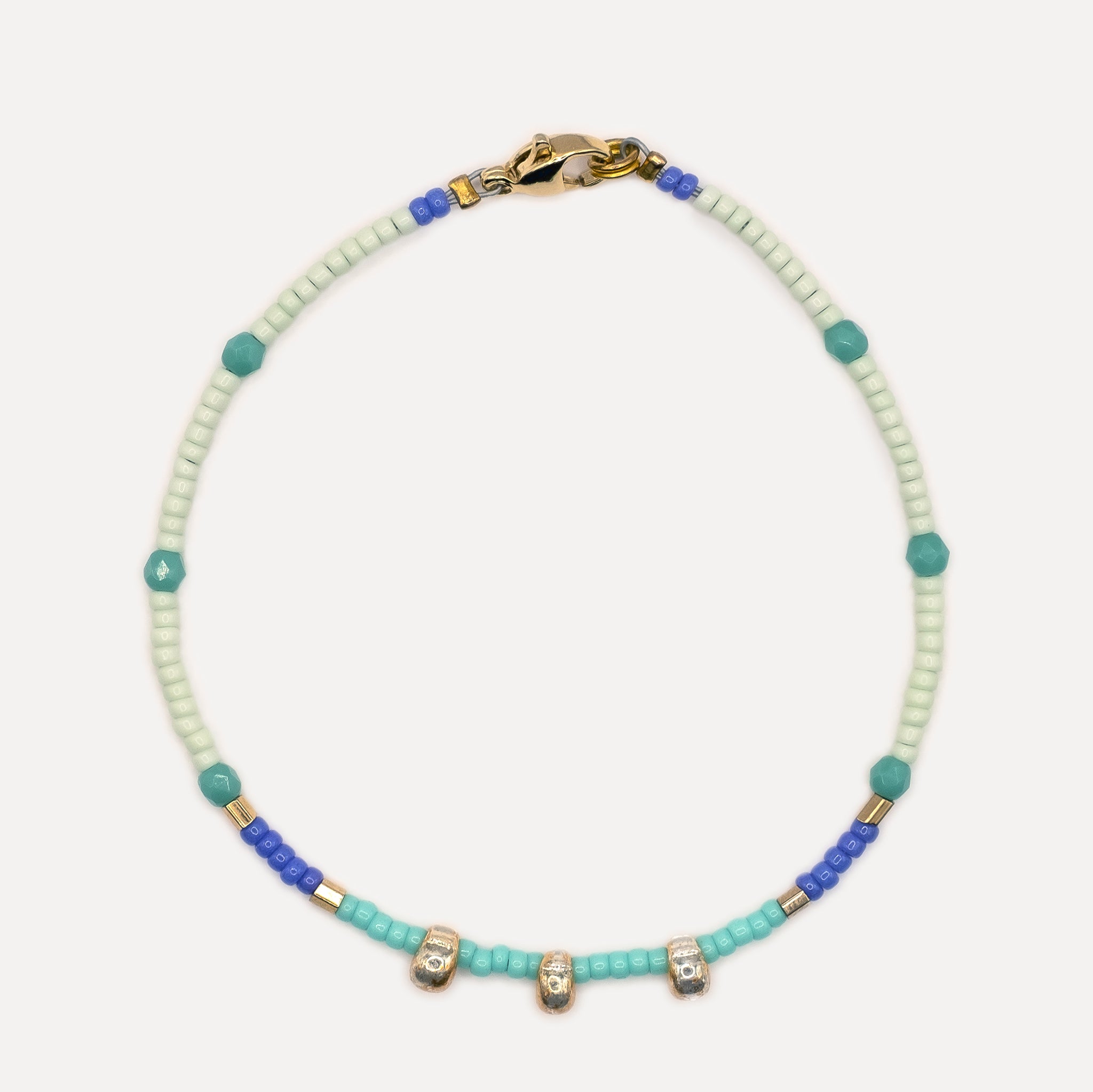 Handmade using the finest quality materials this African-inspired beaded bracelet features gold-plated delica and drop beads, and Japanese miyuki glass beads, thread onto durable soft-flex and finished with an 18k gold-plated clasp. Designed as 1 of set of 3 Lagoon bracelets, or Mix & Match with other colourways in our collection. Layer with your existing jewellery for an elevated, everyday look.
