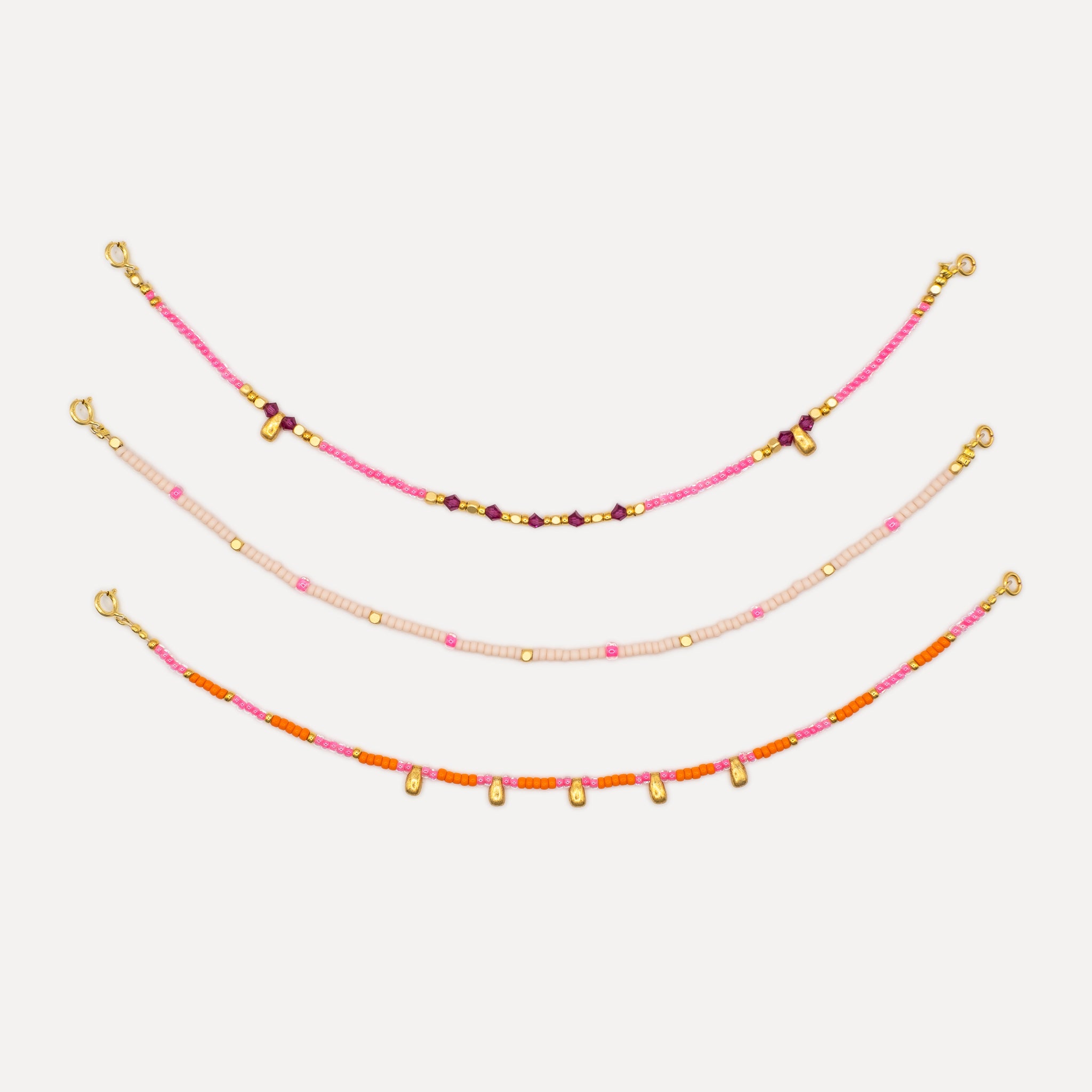 Using the finest quality materials this bracelet is handmade with gold-plated seed and drop beads, Japanese miyuki glass seed beads, thread onto durable soft-flex, and finished with an 18k gold-plated clasp. This bracelet is designed as 1 of a Set of 3, as part of a necklace set, or Mix & Match with bracelets in other colourways from our collection. Dress up or down for an elevated, everyday look.
