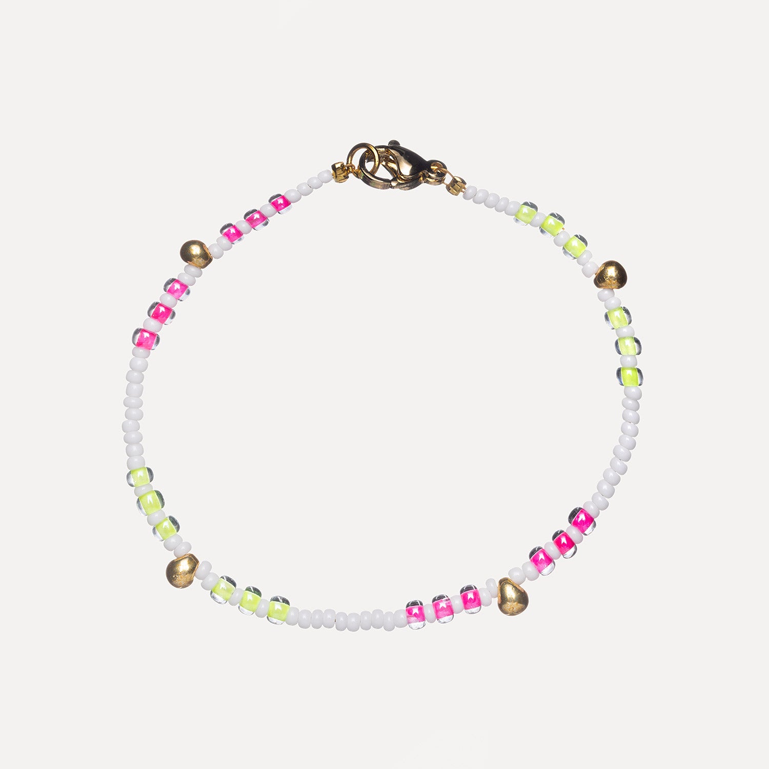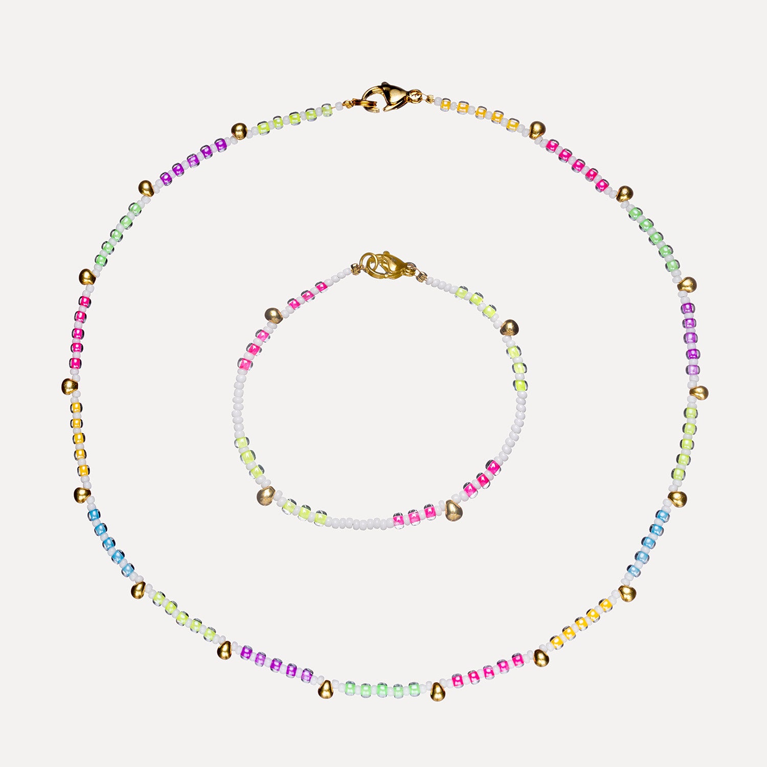 Using the finest quality materials this bracelet is handmade with Japanese miyuki glass seed beads, glass and gold drop beads, thread onto durable soft-flex, finished with an 18k gold-filled clasp. This bracelet is one of a Set of 3, & part of a necklace set from our Island range, or Mix & Match with other bracelets from our collections.