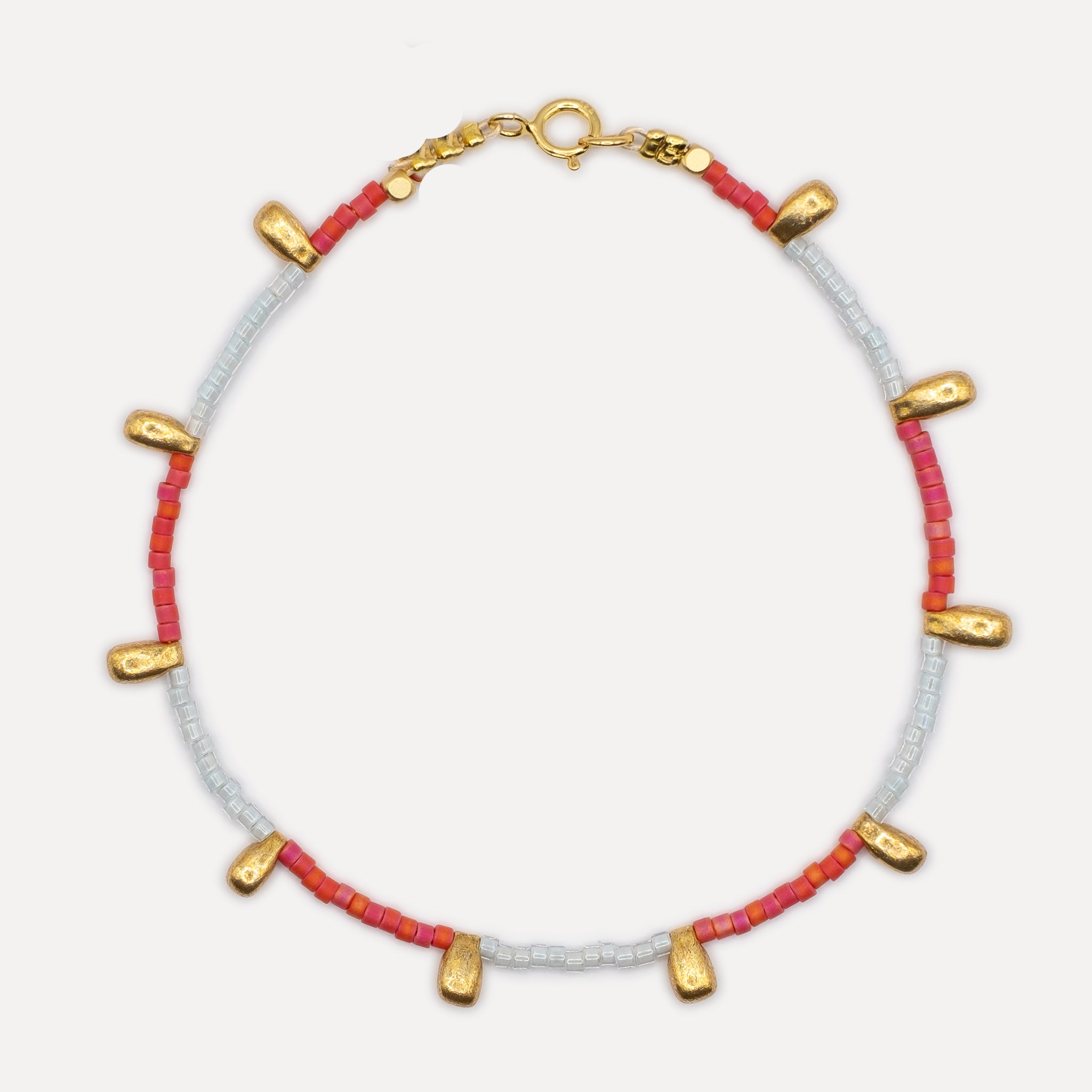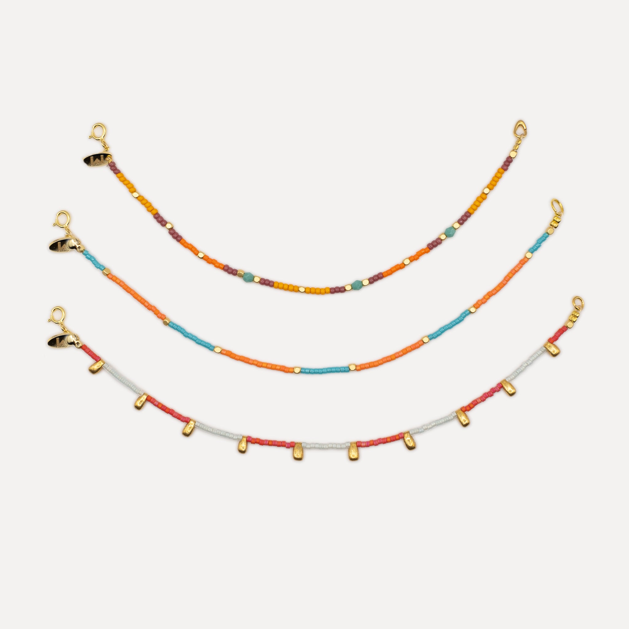 Using the finest quality materials this bracelet is handmade with gold-plated drop beads, and Japanese miyuki glass delica, thread onto durable soft-flex and finished with an 18k gold-filled clasp. This Sahara bracelet is one of a Set of 3, or Mix & Match with other bracelets in our collection. Dress up or down for an elevated, everyday look.