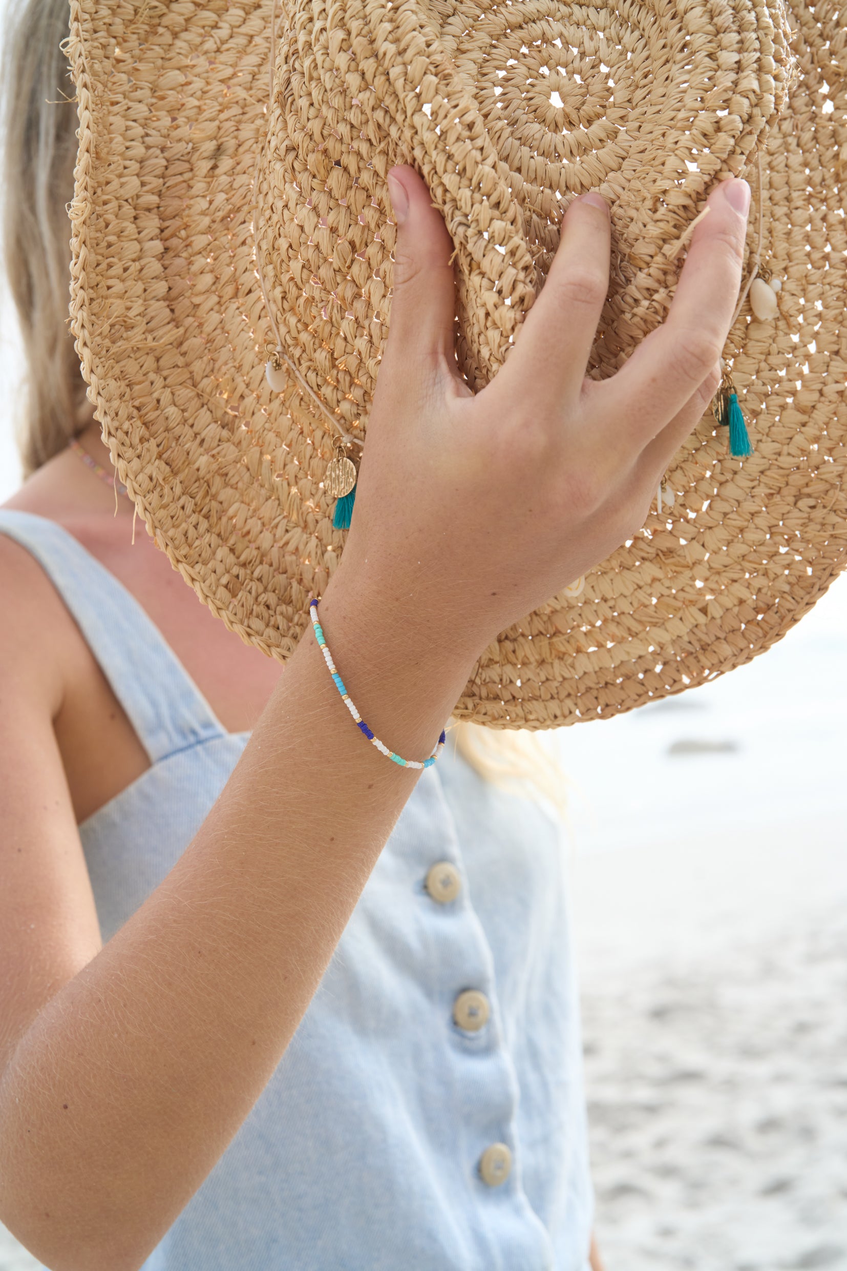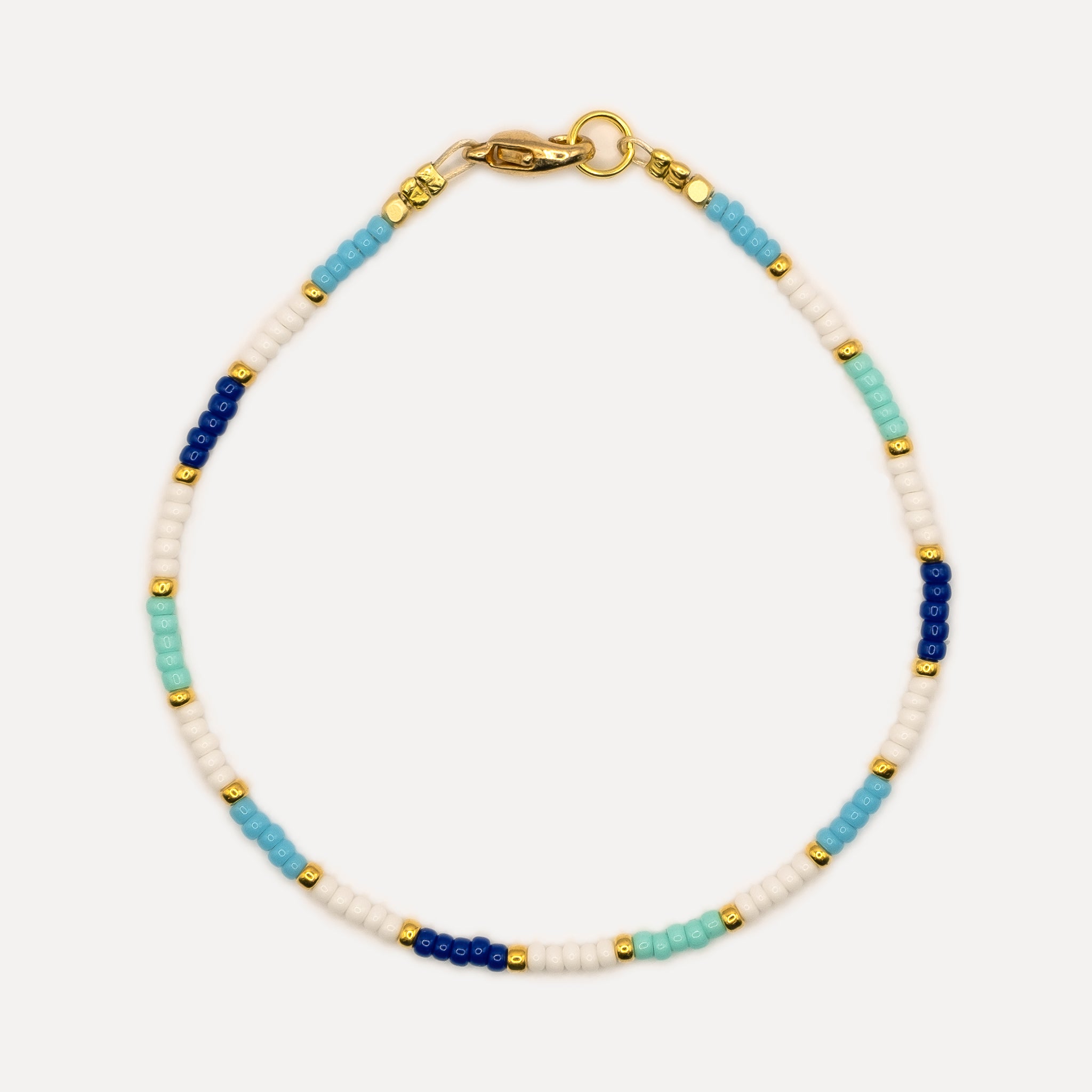 Using the finest quality materials this bracelet is handmade with gold-plated seed beads, and Japanese miyuki glass seed beads, thread onto durable soft-flex, and finished with an 18k gold-filled clasp. This piece is one of a Set of 3 from our Carnival 1 range, & part of the Carnival necklace set, or Mix & Match with other colourways from our collection. Dress up or down for an elevated, everyday look.