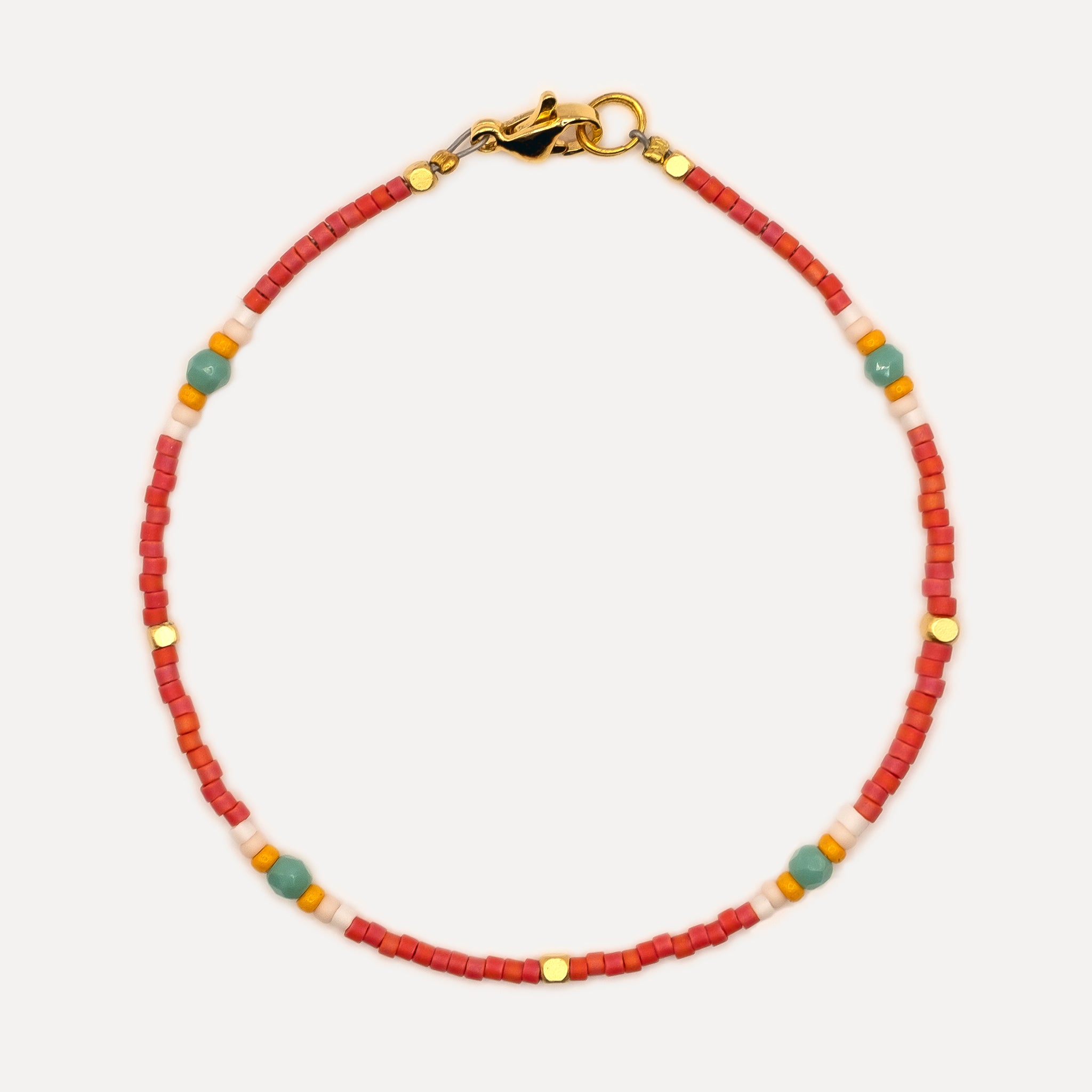 Using the finest quality materials this bracelet is handmade with gold-plated brushed cube beads, and Japanese miyuki glass seed beads, thread onto durable soft-flex and finished with an 18k gold-filled clasp. Mix & Match with more bracelets in our Sahara range, or with other colourways in our collection. Dress up or down for an elevated, everyday look.