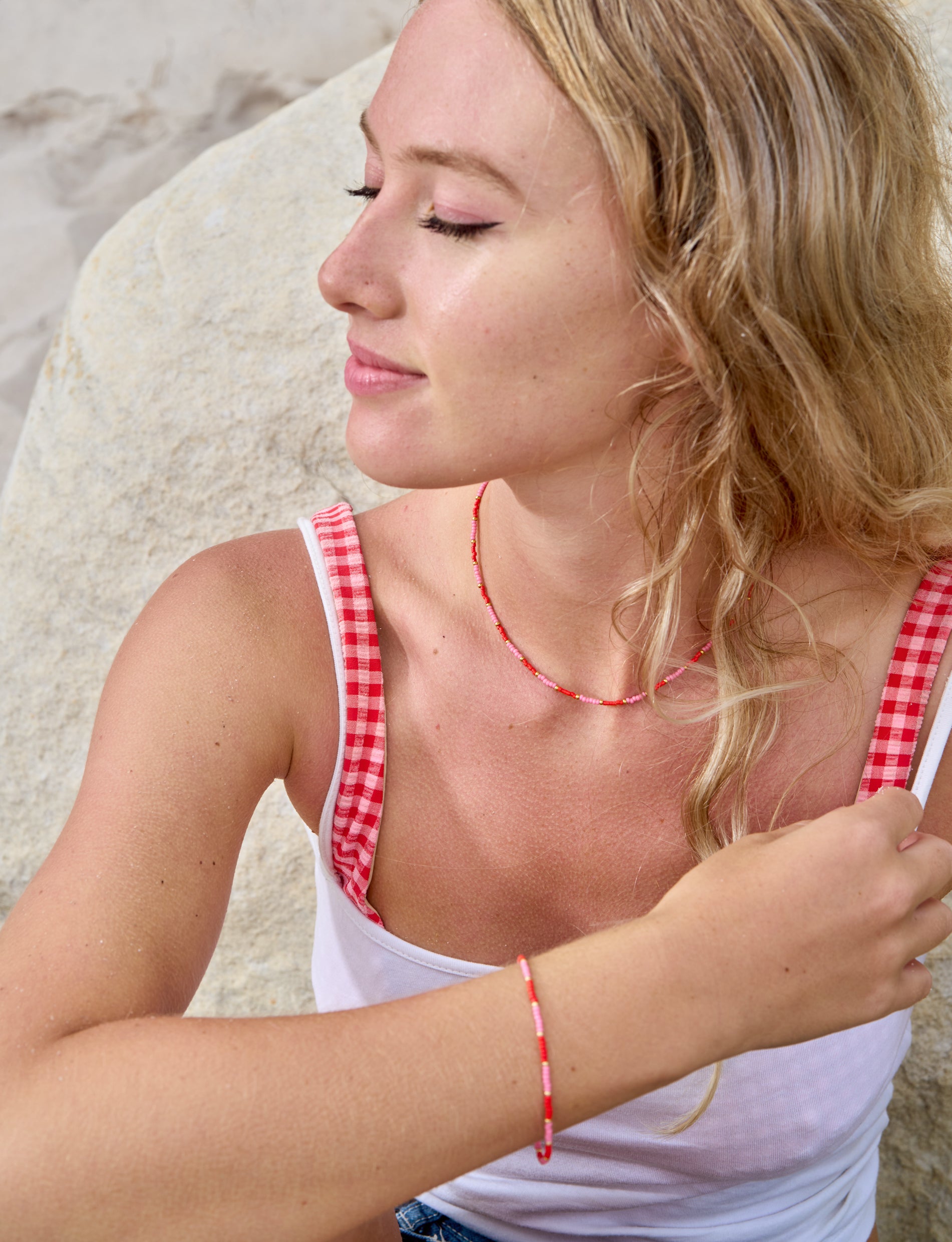 Using the finest quality materials this bracelet is handmade with gold-plated seed beads, Japanese miyuki glass seed beads, thread onto durable soft-flex, and finished with an18k gold-plated clasp. This bracelet is one of a Set of 3, & part of a Carnival necklace set, or Mix & Match with other colourways from our collection. Dress up or down for an elevated, everyday look.