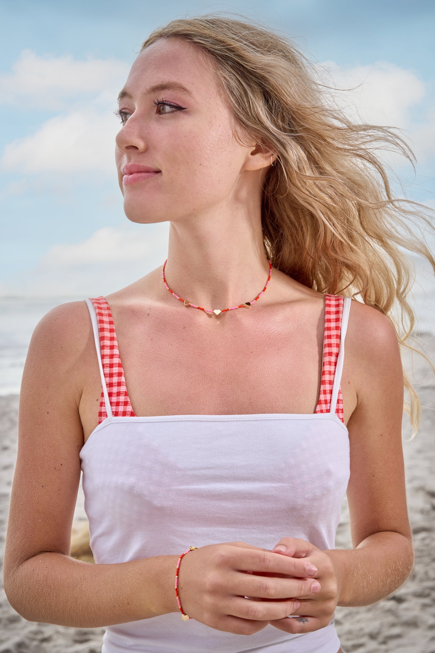 Using the finest quality materials this bracelet is handmade with gold-plated seed beads, Japanese miyuki glass seed beads, & a gold-filled heart, thread onto durable soft-flex, and finished with an18k gold-plated clasp. This piece can be worn as part of a necklace set, or Mix & Match with other colourways in our collection. Dress up or down for an elevated, everyday look.