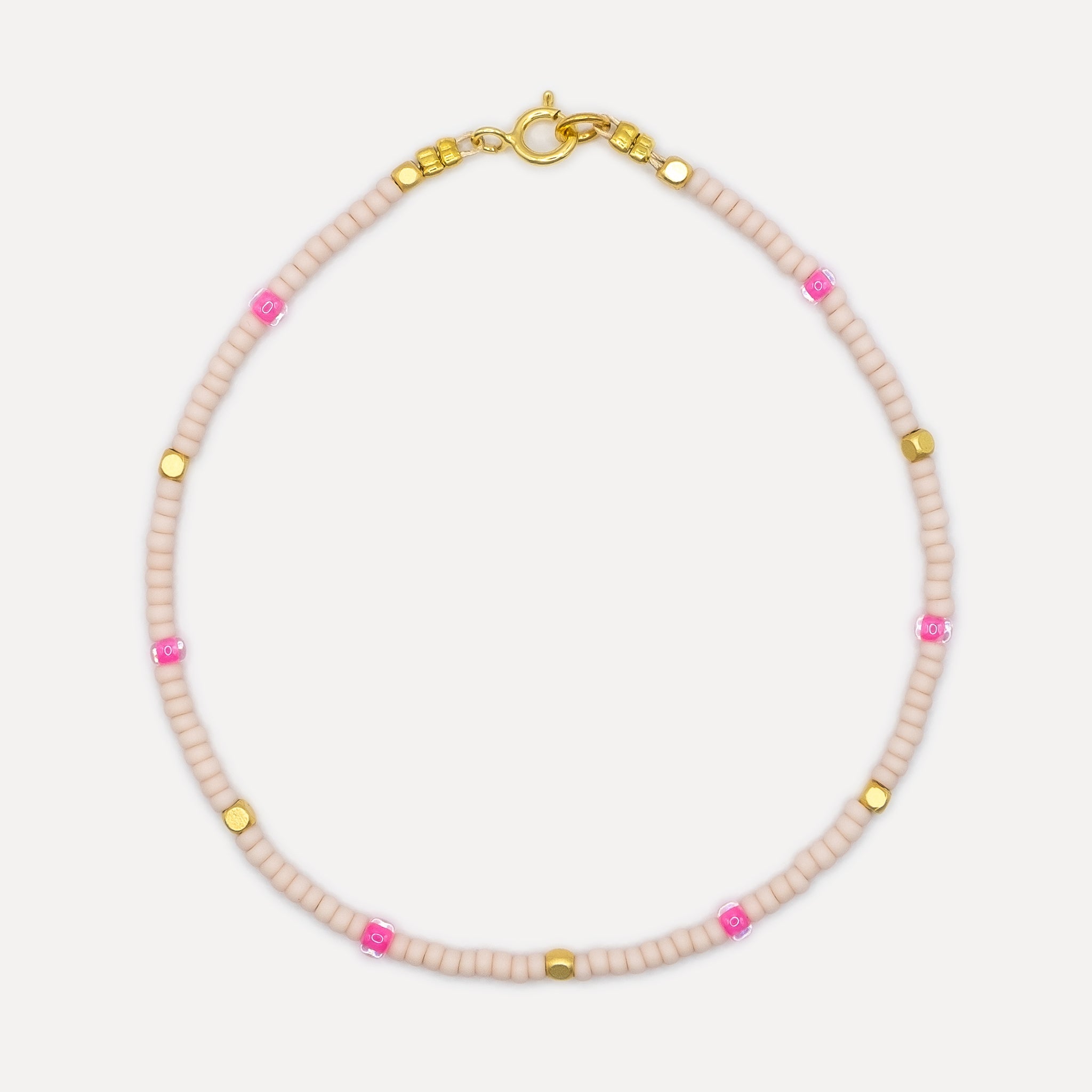 Using the finest quality materials this anklet is handmade with gold-plated brushed cube beads, and Japanese miyuki glass seed beads, thread onto durable soft-flex, and finished with an 18k gold-plated clasp. This piece is one of a Set of 3, or Mix & Match with other colourways in our collection.