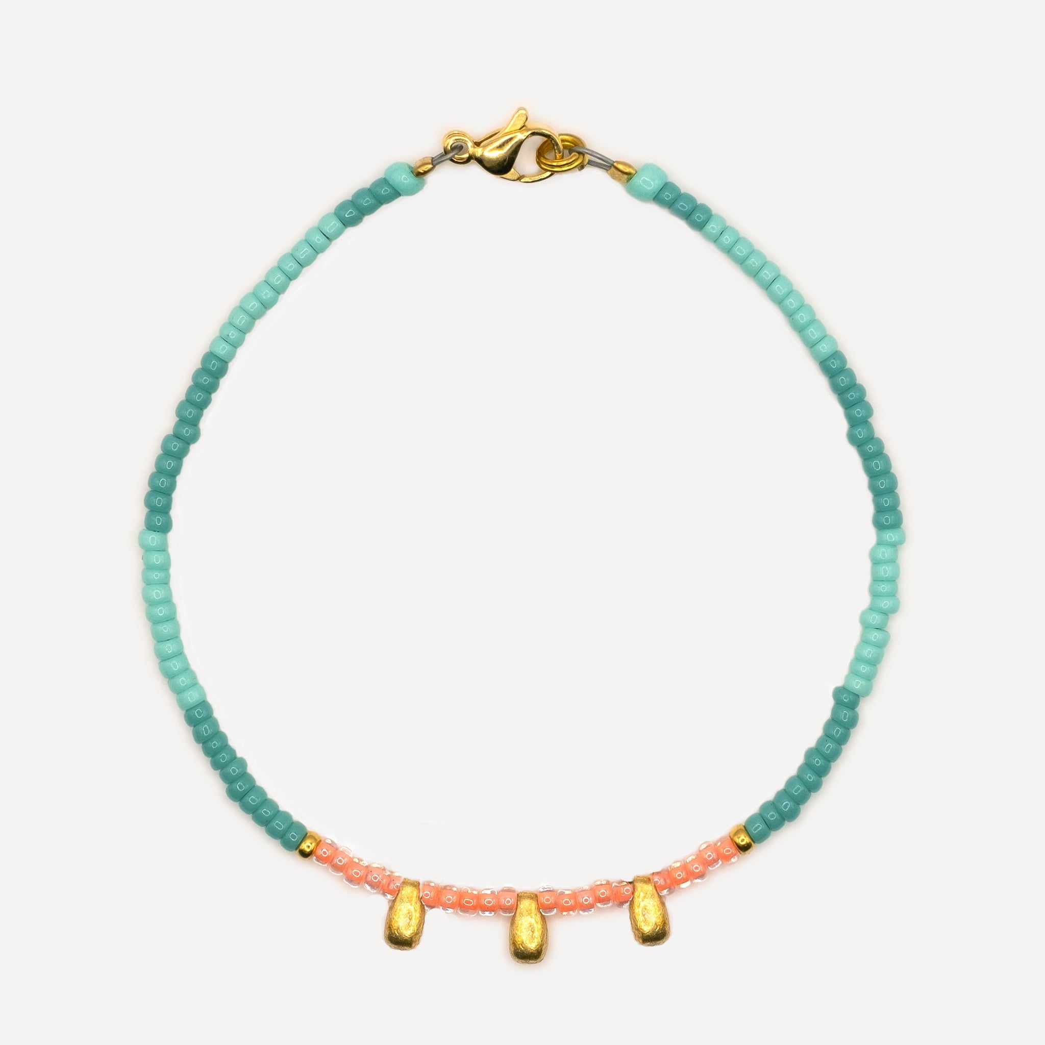 Handmade using the finest quality materials this African-inspired beaded anklet features gold-plated drop beads, Czech seed beads, and Japanese miyuki glass seed beads, thread onto durable soft-flex and finished with an 18k gold-plated clasp. Designed as 1 of the set of 3, or Mix & Match with other colourways in our collection.