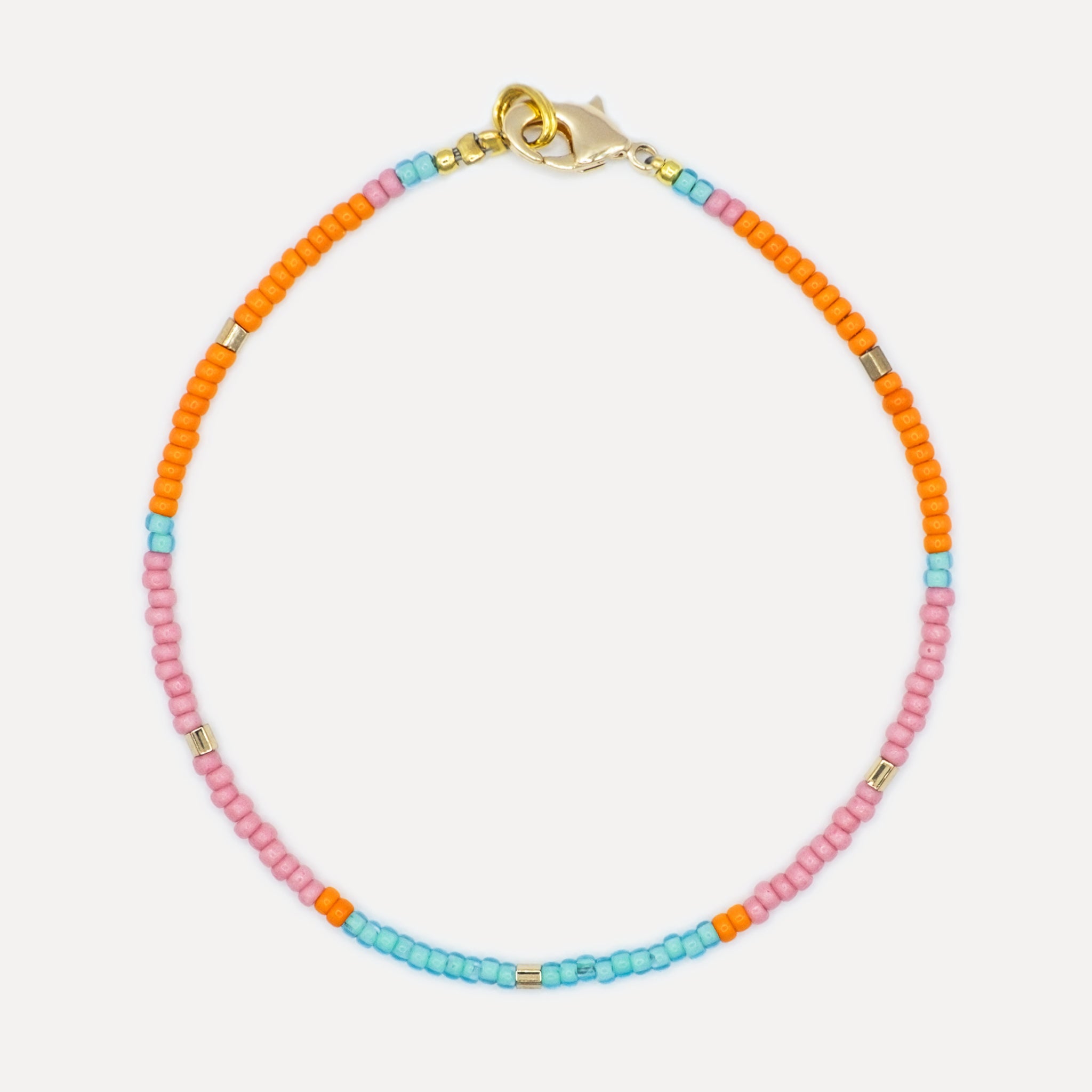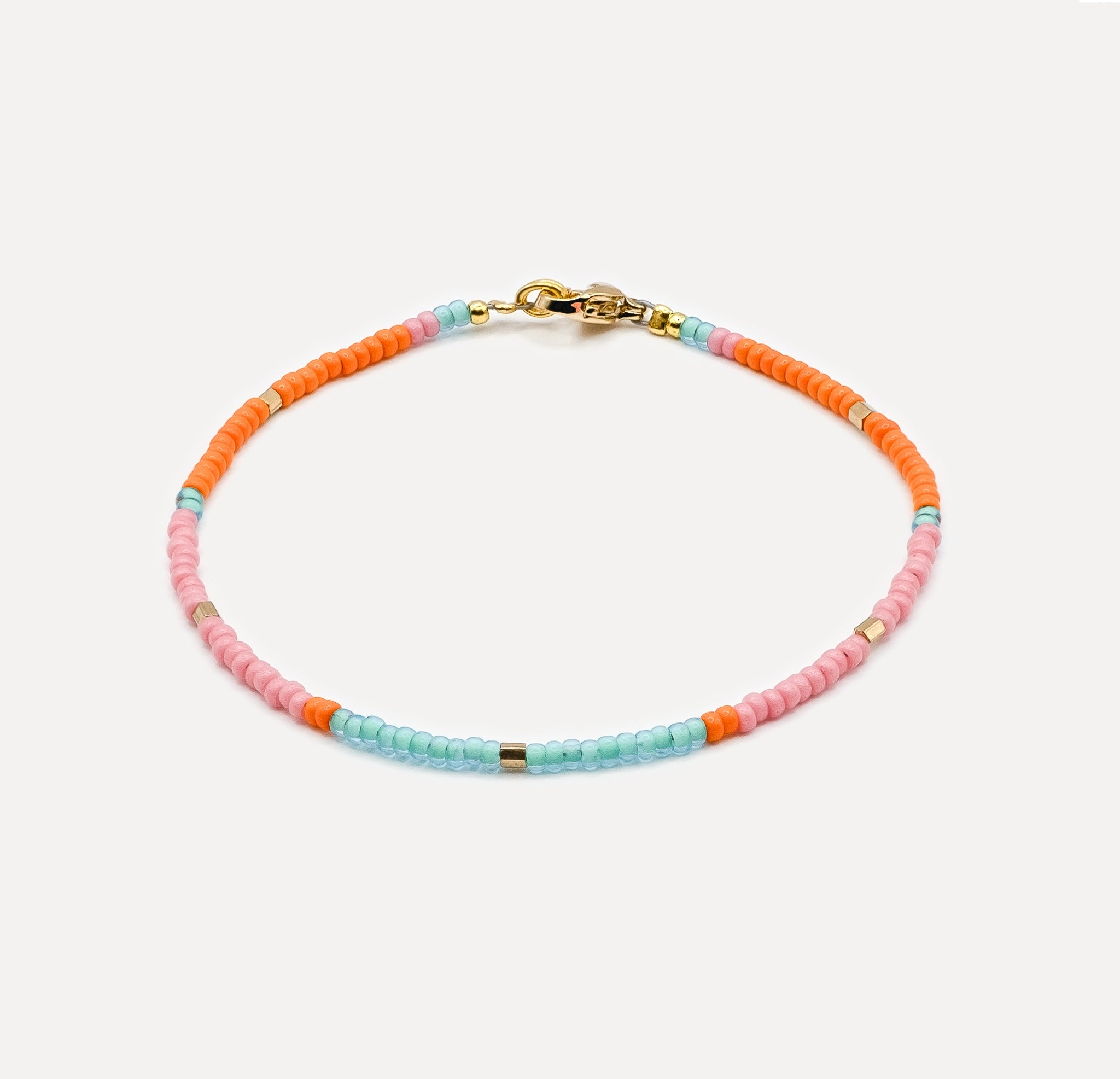 Using the finest quality materials this anklet is handmade with gold-plated delica beads, and Japanese miyuki glass seed beads, thread onto durable soft-flex, and finished with an 18k gold-plated clasp. Mix & Match with other colourways in our collection.