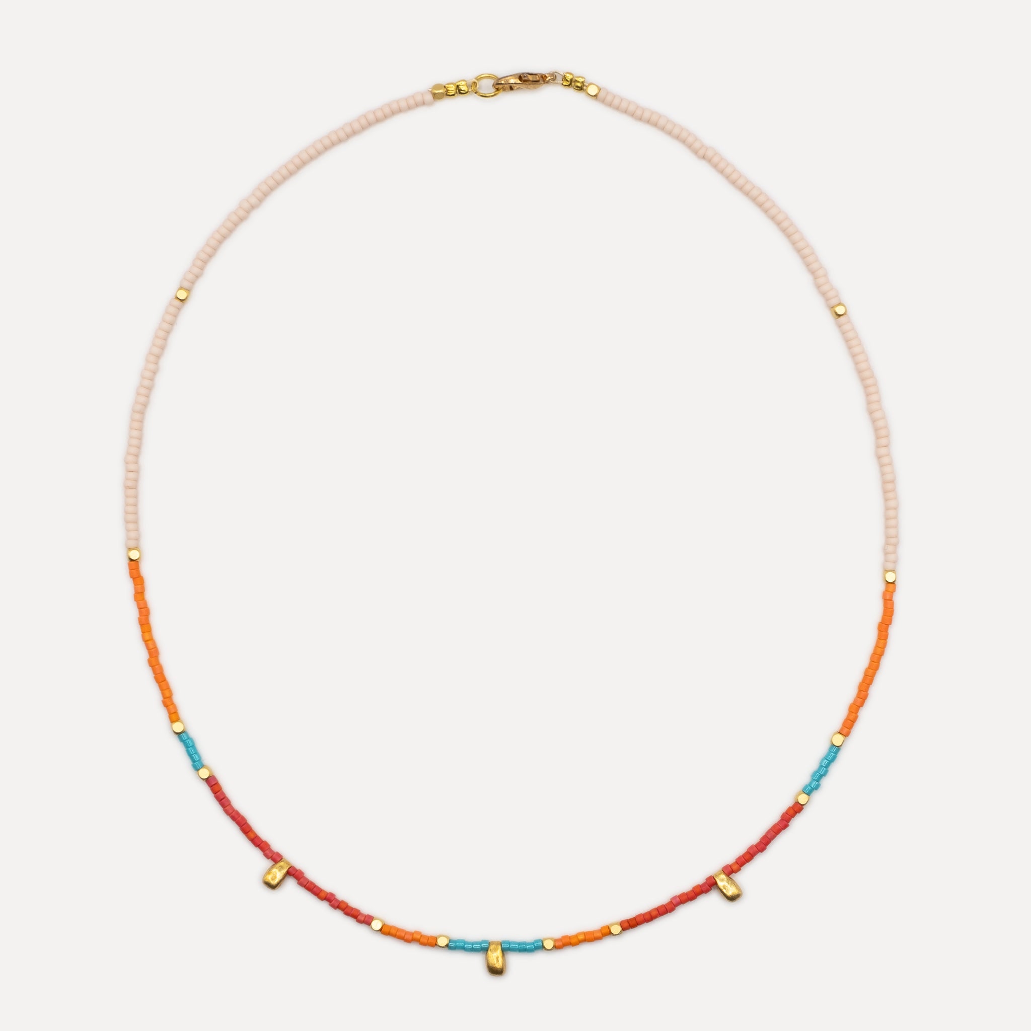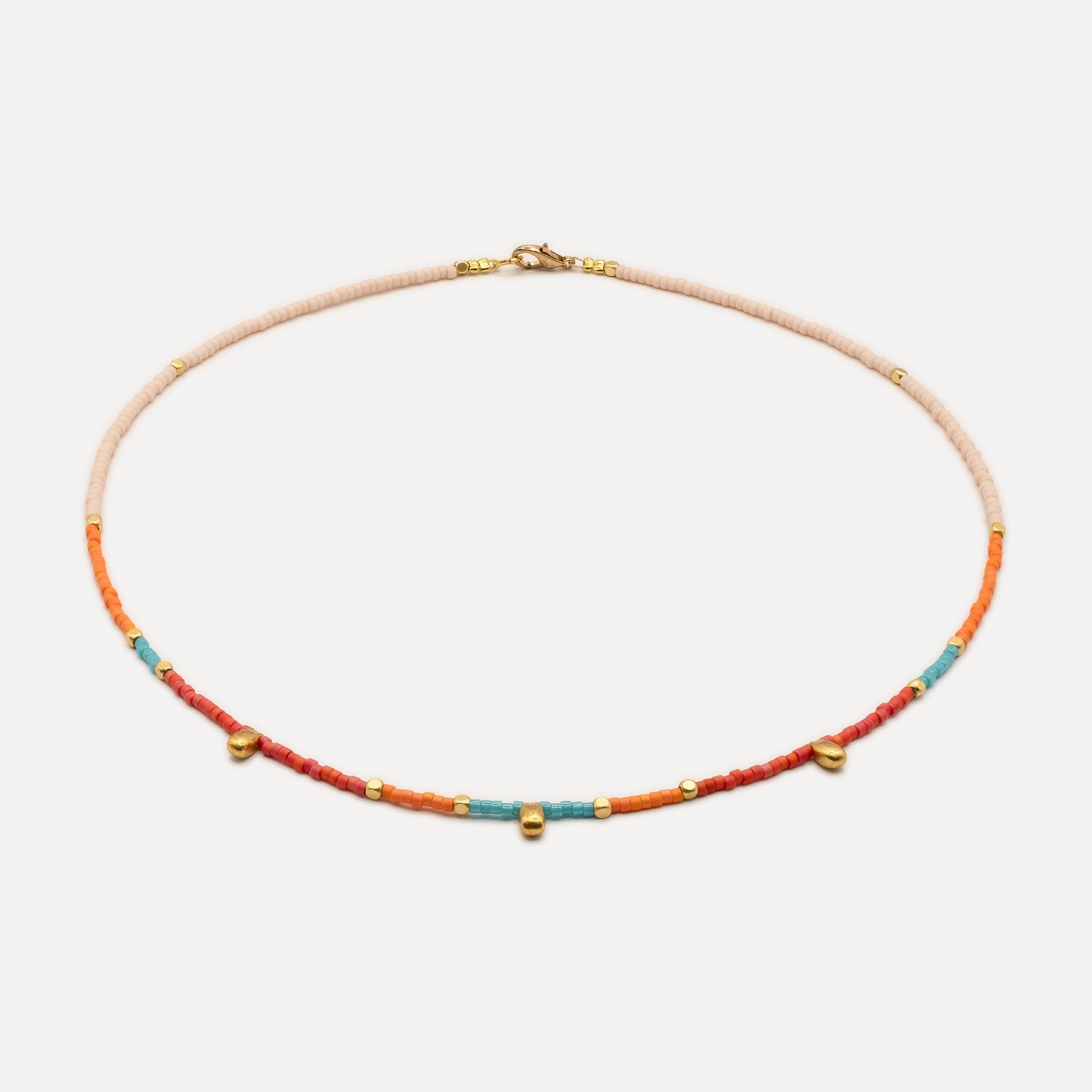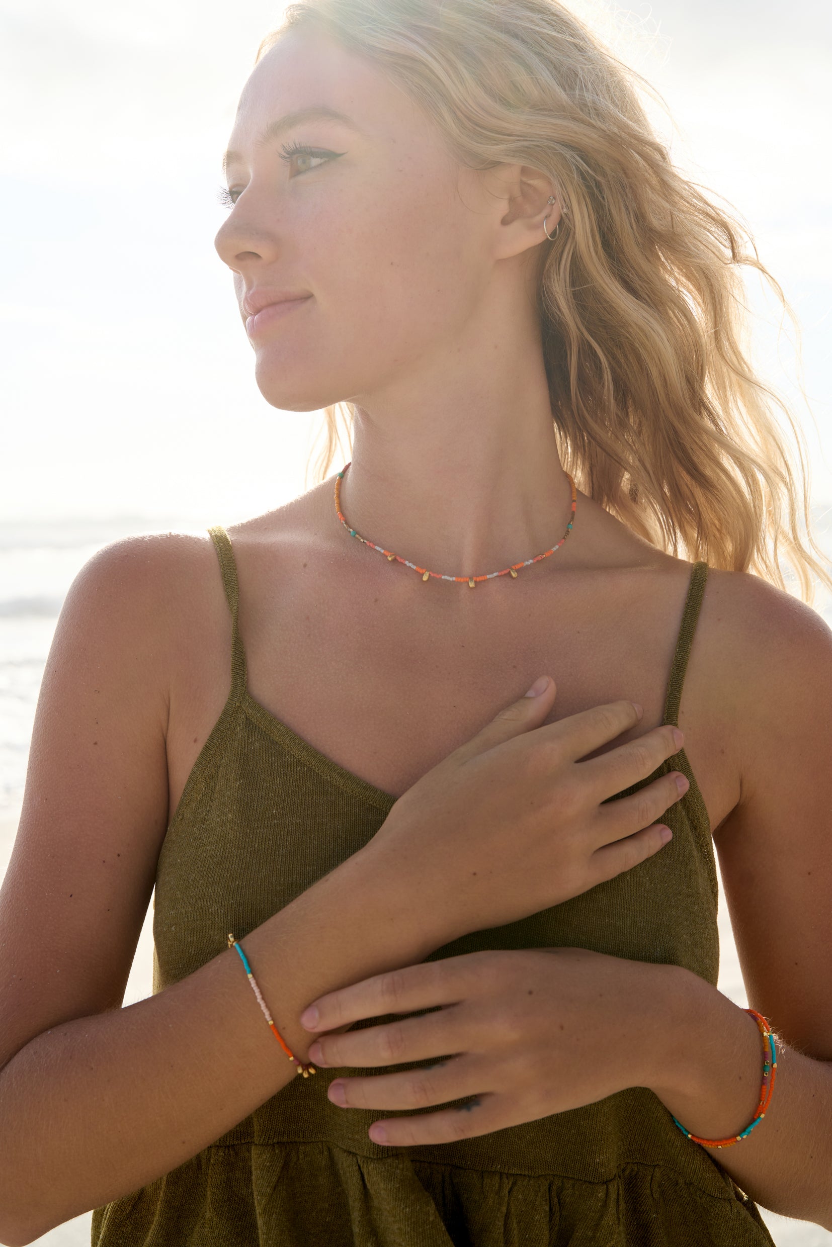 Using the finest quality materials this necklace is handmade with gold-plated drop and brushed cube beads, Czech seed beads, and Japanese miyuki glass delica, thread onto durable soft-flex and finished with an 18k gold-plated clasp. This Sahara Gold Drop Necklace is designed to be layered with other pieces from our collection, and with your existing jewellery. Dress up or down for an elevated, everyday look.