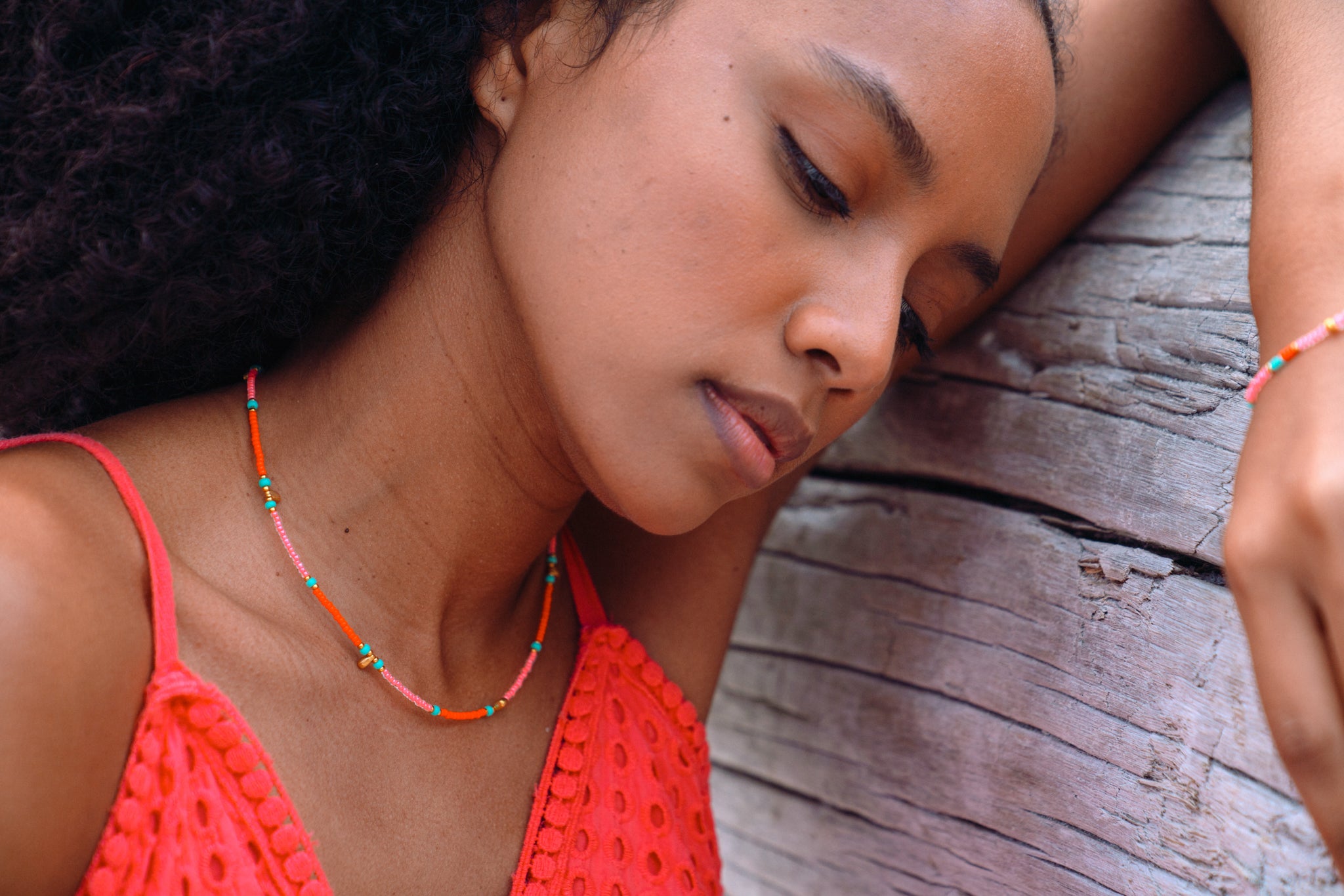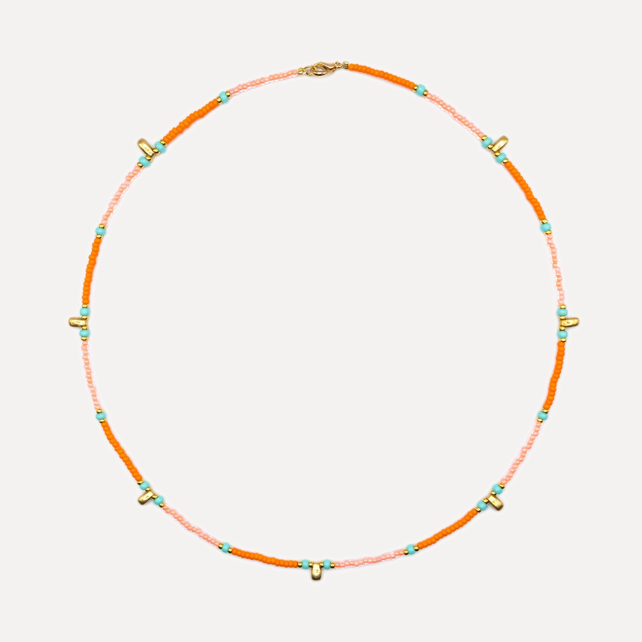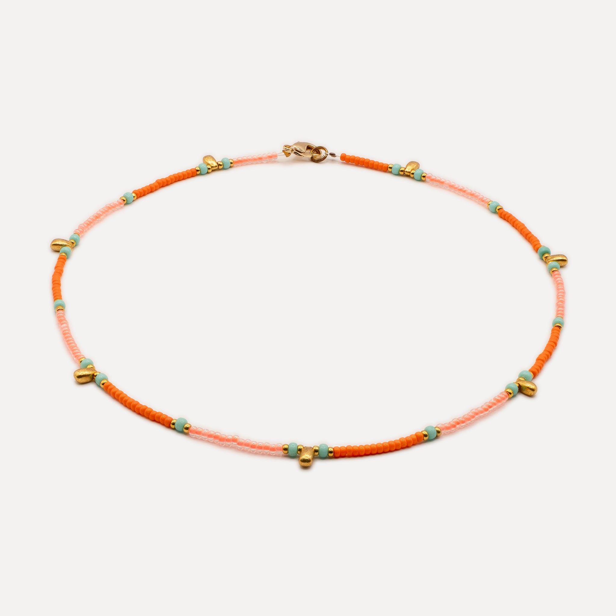Using the finest quality materials this necklace is hand-crafted with gold-plated drop beads, Czech seed beads, and Japanese miyuki glass seed beads, thread onto durable soft-flex and finished with an 18k gold-plated clasp. The Papaya Gold Drop Necklace is designed to be layered with other pieces from our collection, and with your existing jewellery. Dress up or down for an elevated, everyday look.