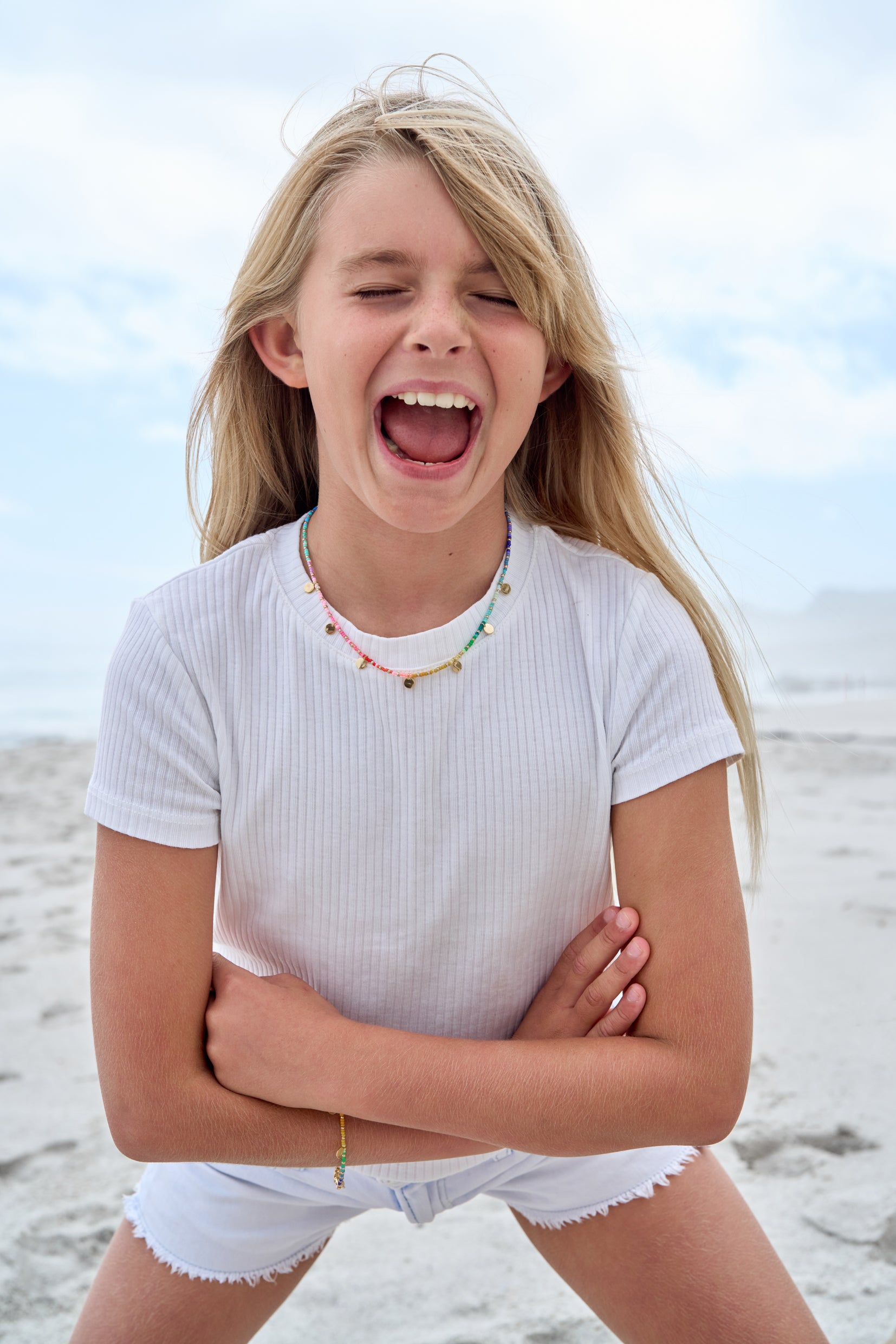 Using the finest quality materials this necklace is handmade with gold-plated charms, Japanese miyuki gold-plated seed beads, and Czech glass seed & delica beads, thread onto durable soft-flex and finished with an 18k gold-filled clasp. This set is designed to be worn as part of a set, or to be layered with other pieces from our collection, and with your existing jewellery. Dress up or down for an elevated, everyday look.