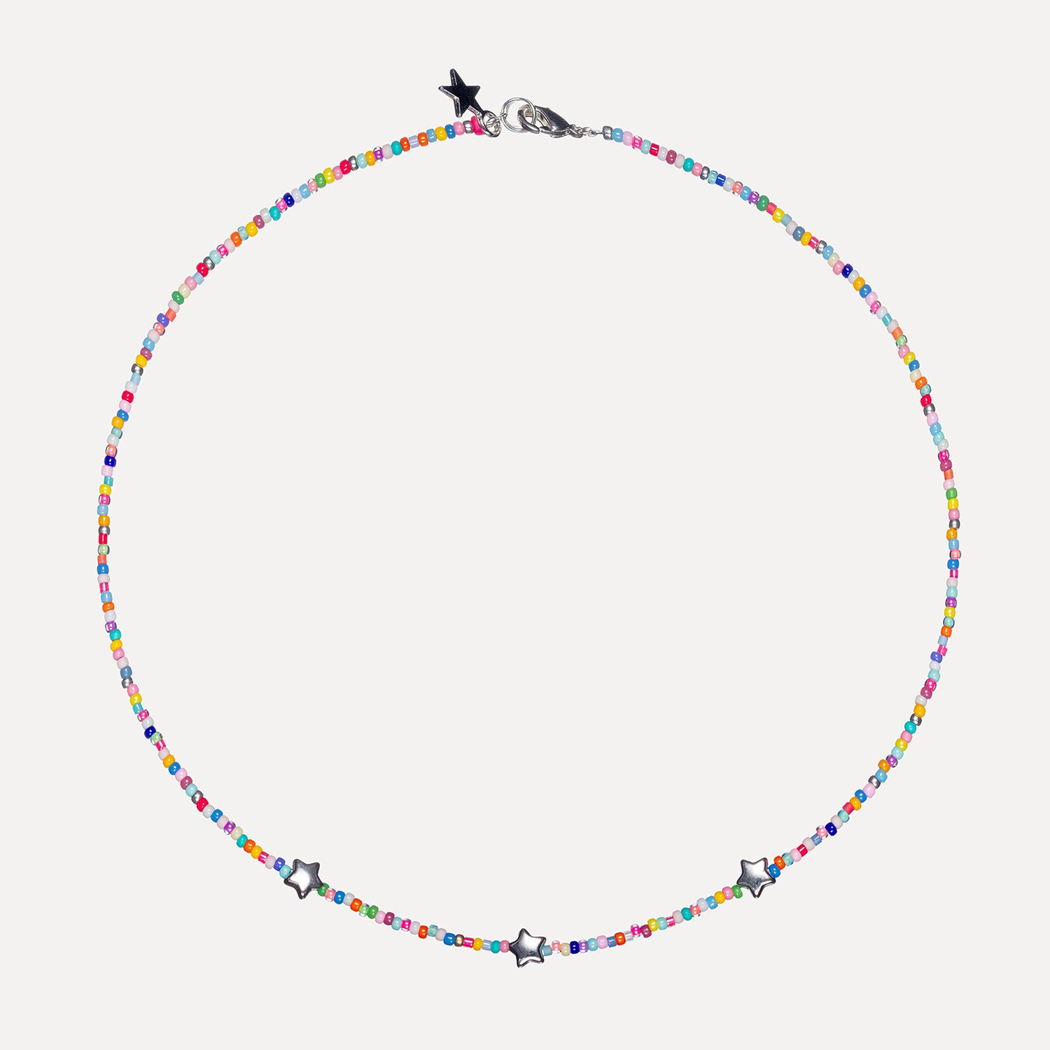 Using the finest quality materials this necklace is handmade with silver-plated stars, Japanese miyuki silver-plated seed beads, and Czech glass seed & delica beads, thread onto durable soft-flex, finished with a silver-plated clasp. This piece is designed as part of a necklace set, to be layered with other pieces from our collection, and with your existing jewellery. Dress up or down for an elevated, everyday look.
