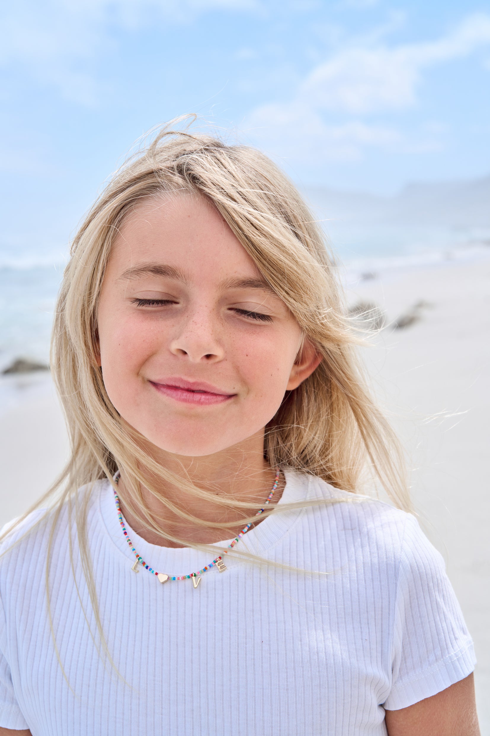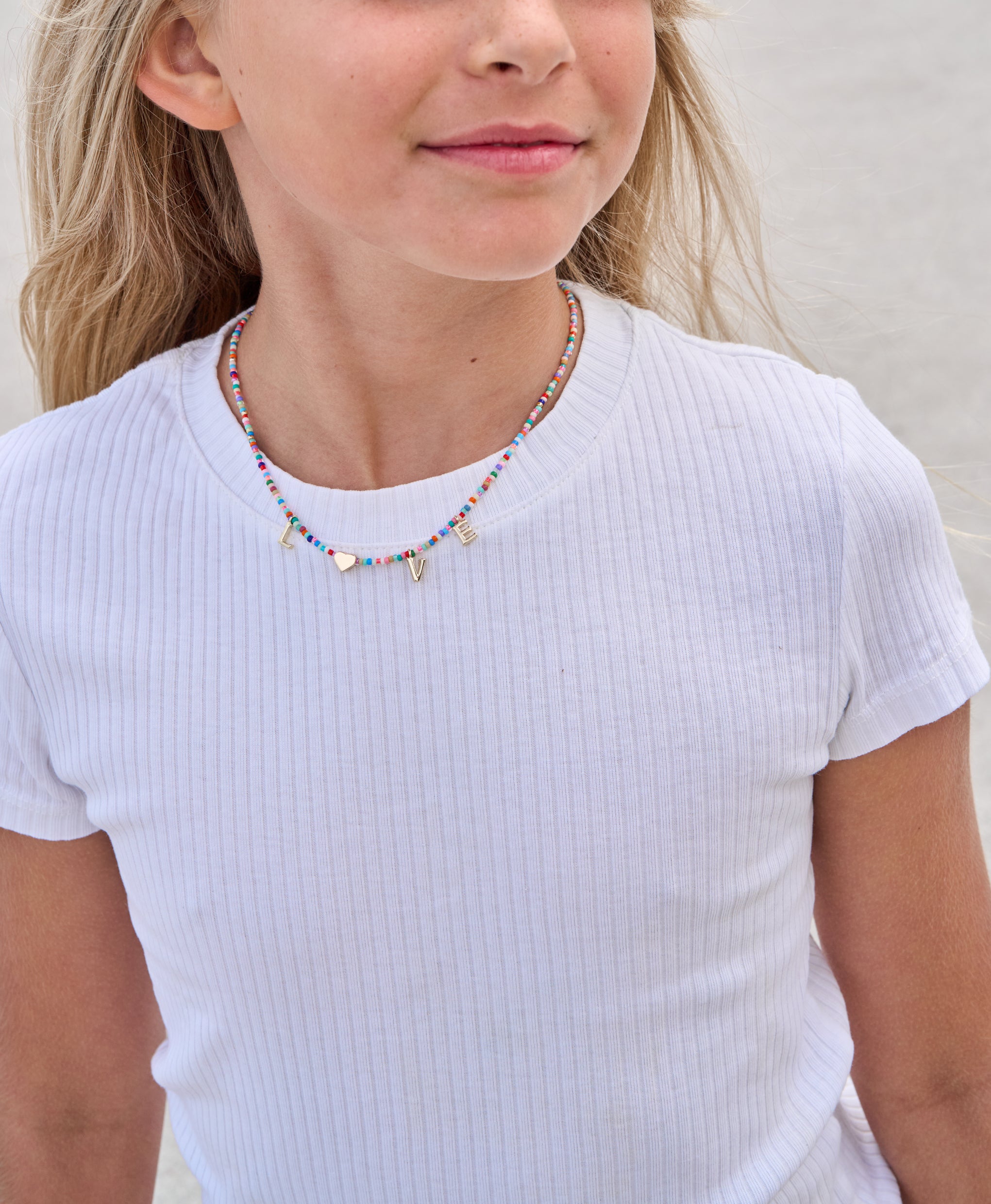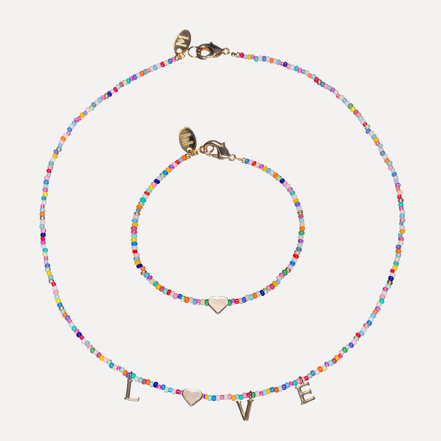 Using the finest quality materials this necklace is handmade with 14K gold-plated letters & heart, Japanese miyuki gold-plated seed beads, Czech glass seed & delica beads, thread onto durable soft-flex, finished with an 18k gold-filled clasp. This bracelet was designed as part of a necklace set, or to be layered with other pieces from our collection and with your existing jewellery. Dress up or down for an elevated, everyday look.
