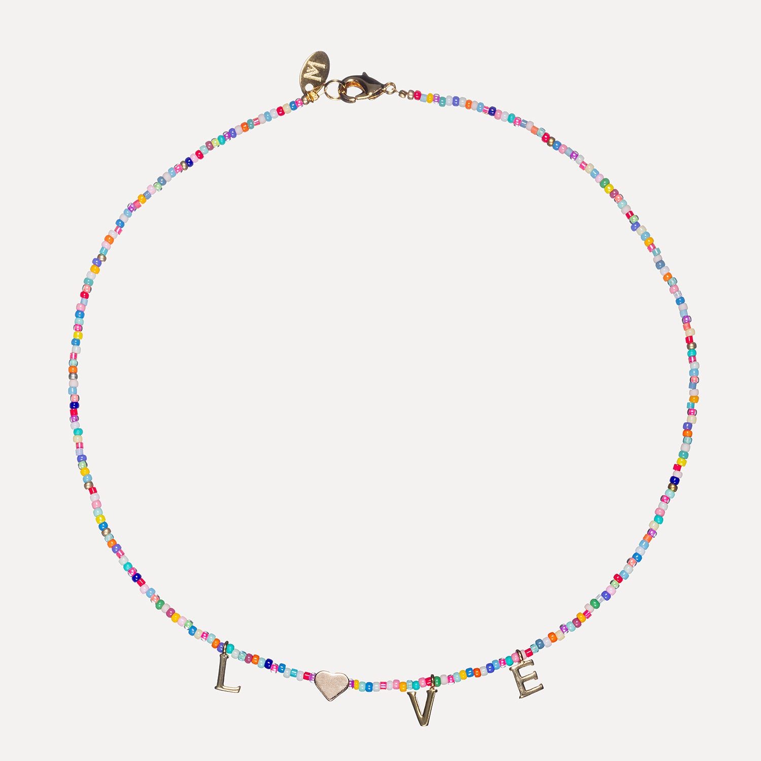 Using the finest quality materials this necklace is handmade with 14K gold-plated letters & heart, Japanese miyuki gold-plated seed beads, and Czech glass seed & delica beads, thread onto durable soft-flex and finished with an 18k gold-filled clasp. This piece is designed to be layered with other pieces from our collection, and with your existing jewellery. Dress up or down for an elevated, everyday look.