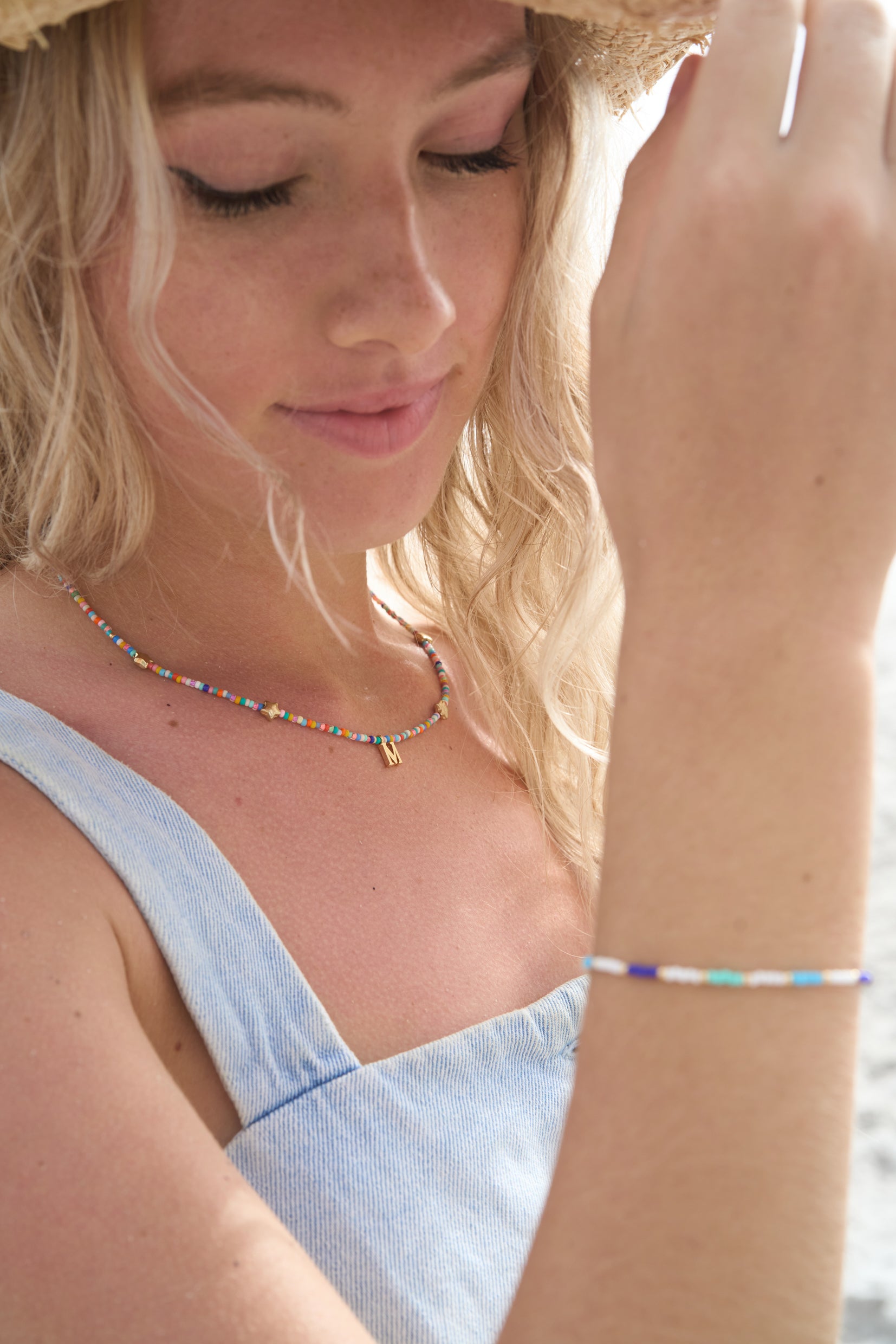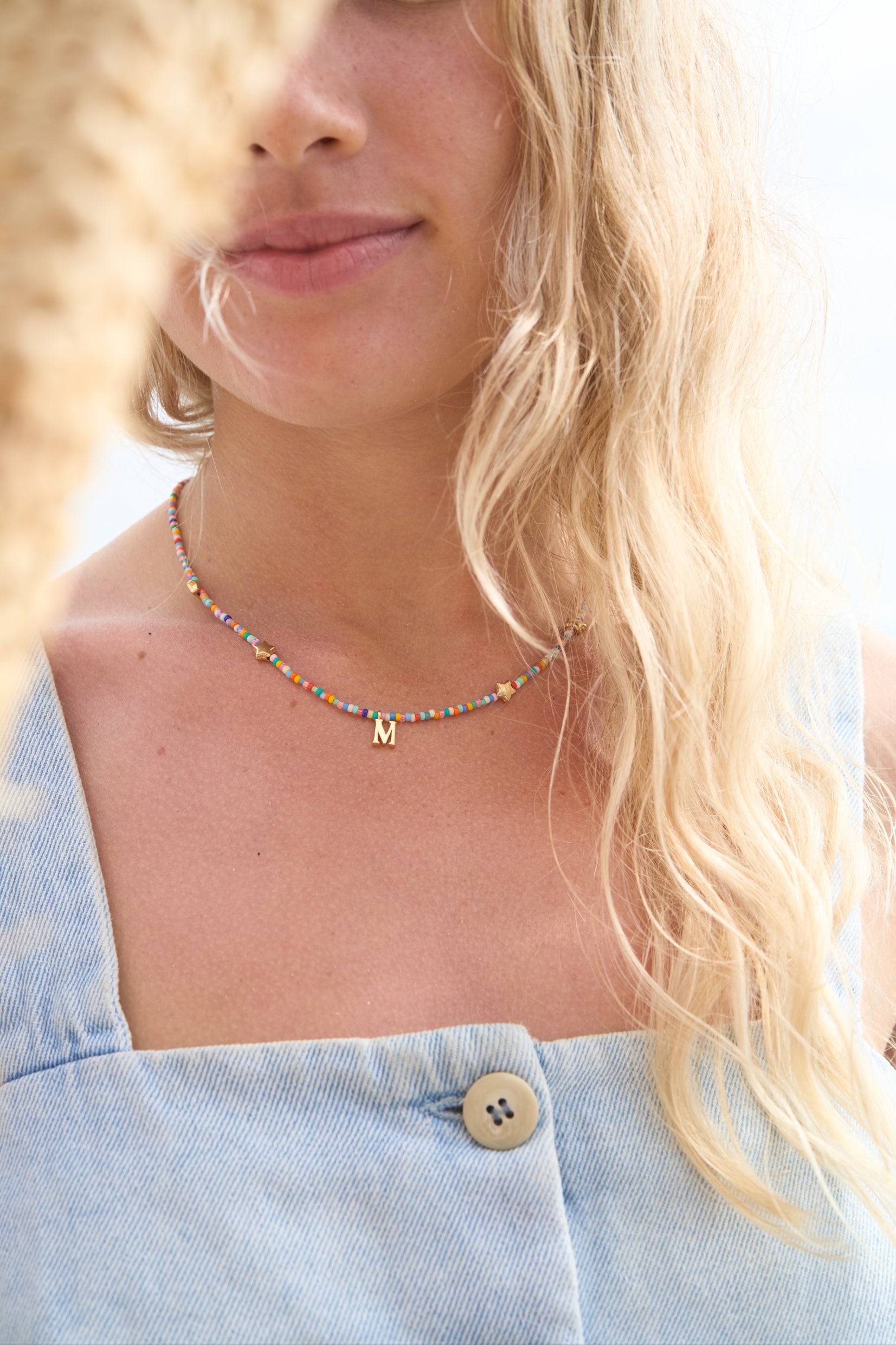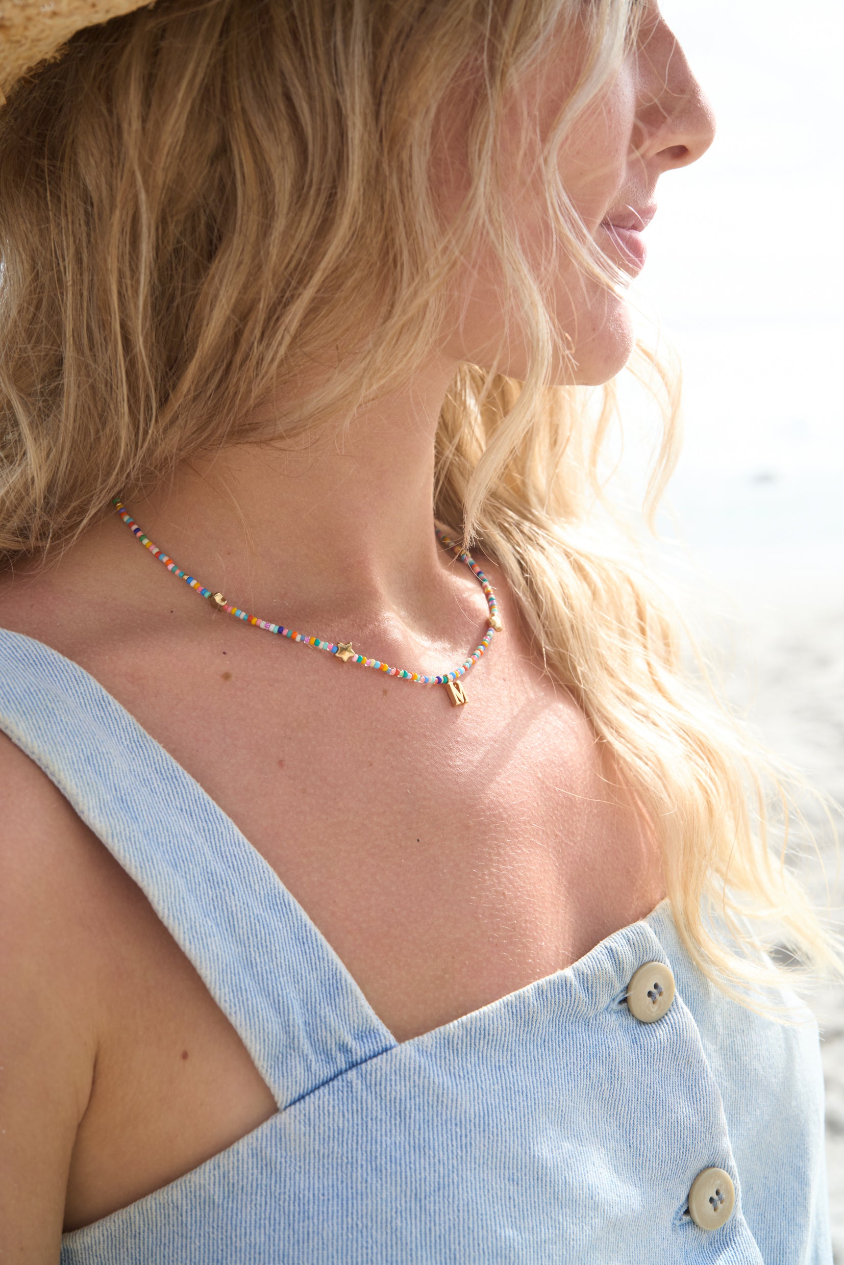 Using the finest quality materials this necklace is handmade with gold-plated stars and a gold-filled initial (of your choice), Japanese miyuki gold-plated seed beads, and Czech glass seed & delica beads, thread onto durable soft-flex and finished with a gold-filled clasp. This piece is designed as part of a set, and to be layered with other pieces from our collection, and with your existing jewellery. Dress up or down for an elevated, everyday look.