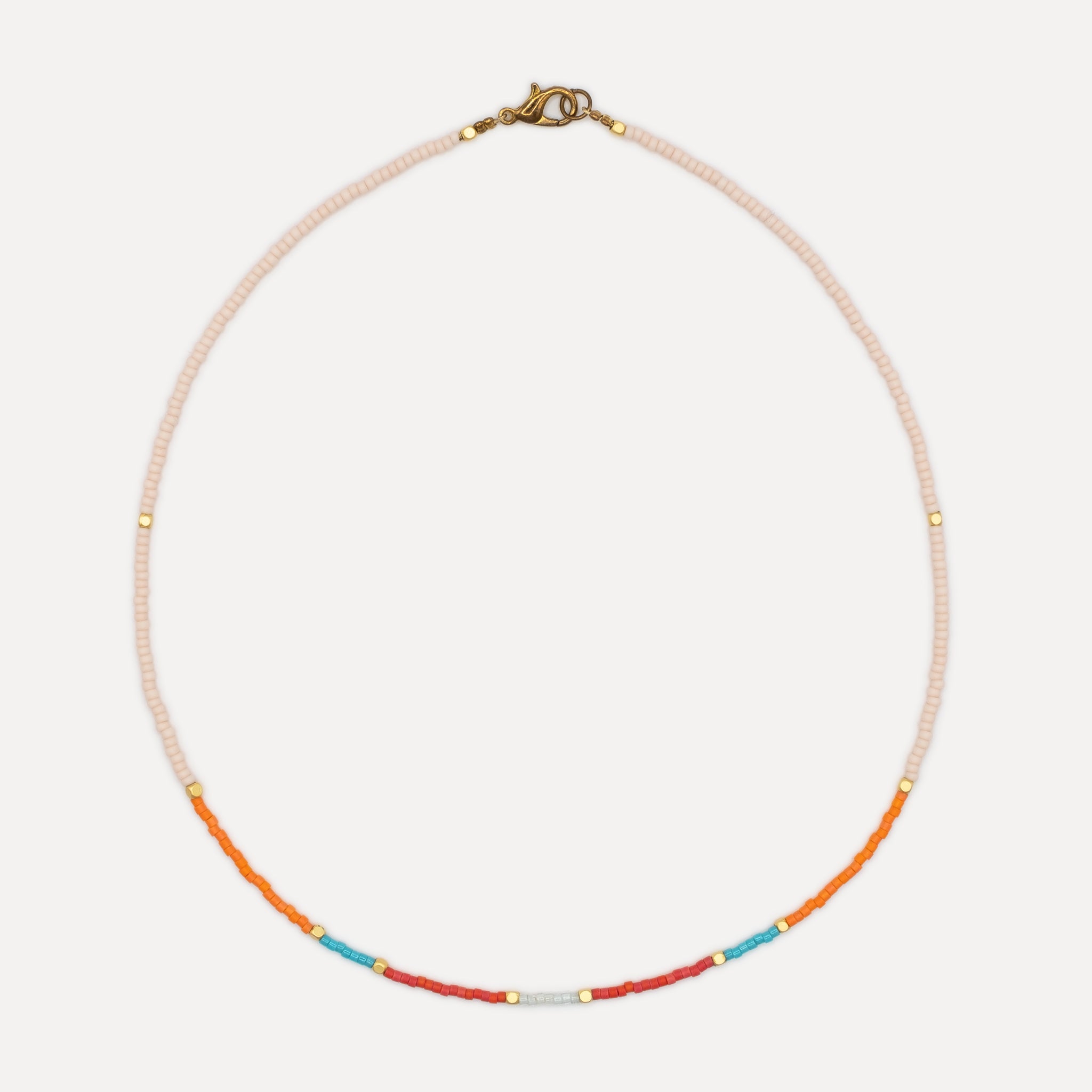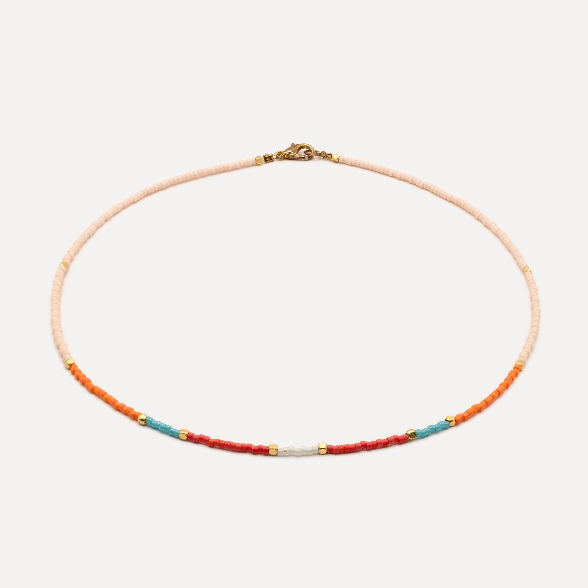 Using the finest quality materials this necklace is handmade with gold-plated brushed cube beads, Czech seed beads, and Japanese miyuki glass delica, thread onto durable soft-flex and finished with an 18k gold-plated clasp. The Lamu Sahara Necklace is designed to be layered with other pieces from our collection, and with your existing jewellery. Dress up or down for an elevated, everyday look.