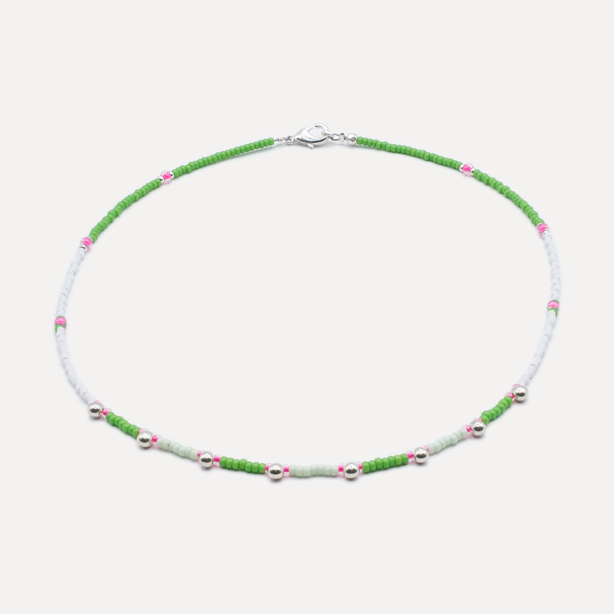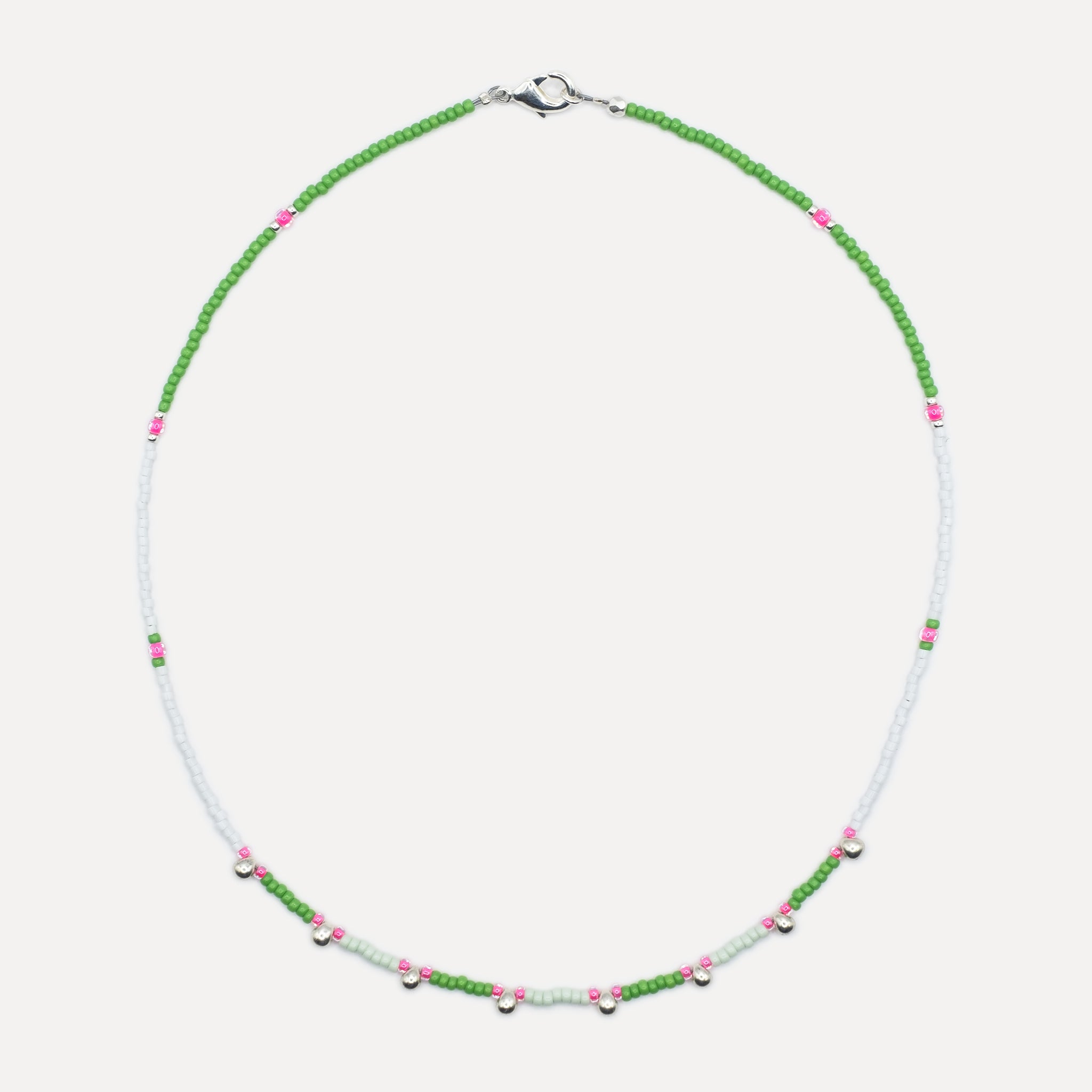 Using the finest quality materials, this necklace is handmade with silver-plated drop beads, Czech seed beads, and Japanese miyuki glass delica, thread onto durable soft-flex and finished with a silver-plated clasp. This necklace is designed to be layered with other pieces from our collection, and with your existing jewellery, Dress up or down for an elevated, everyday look.