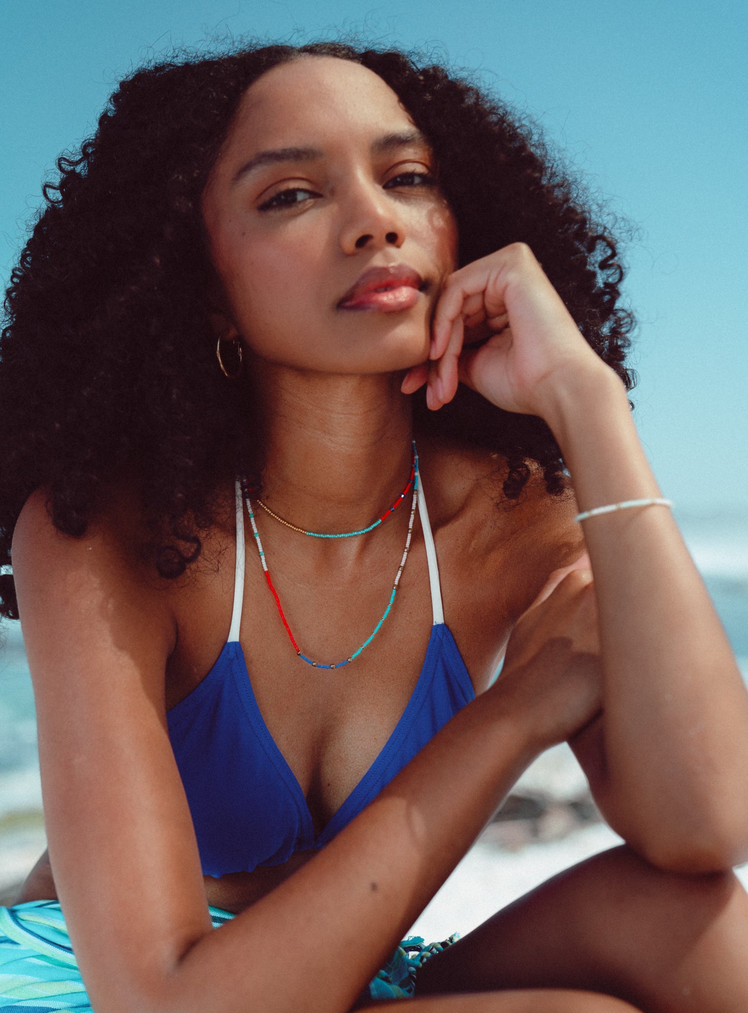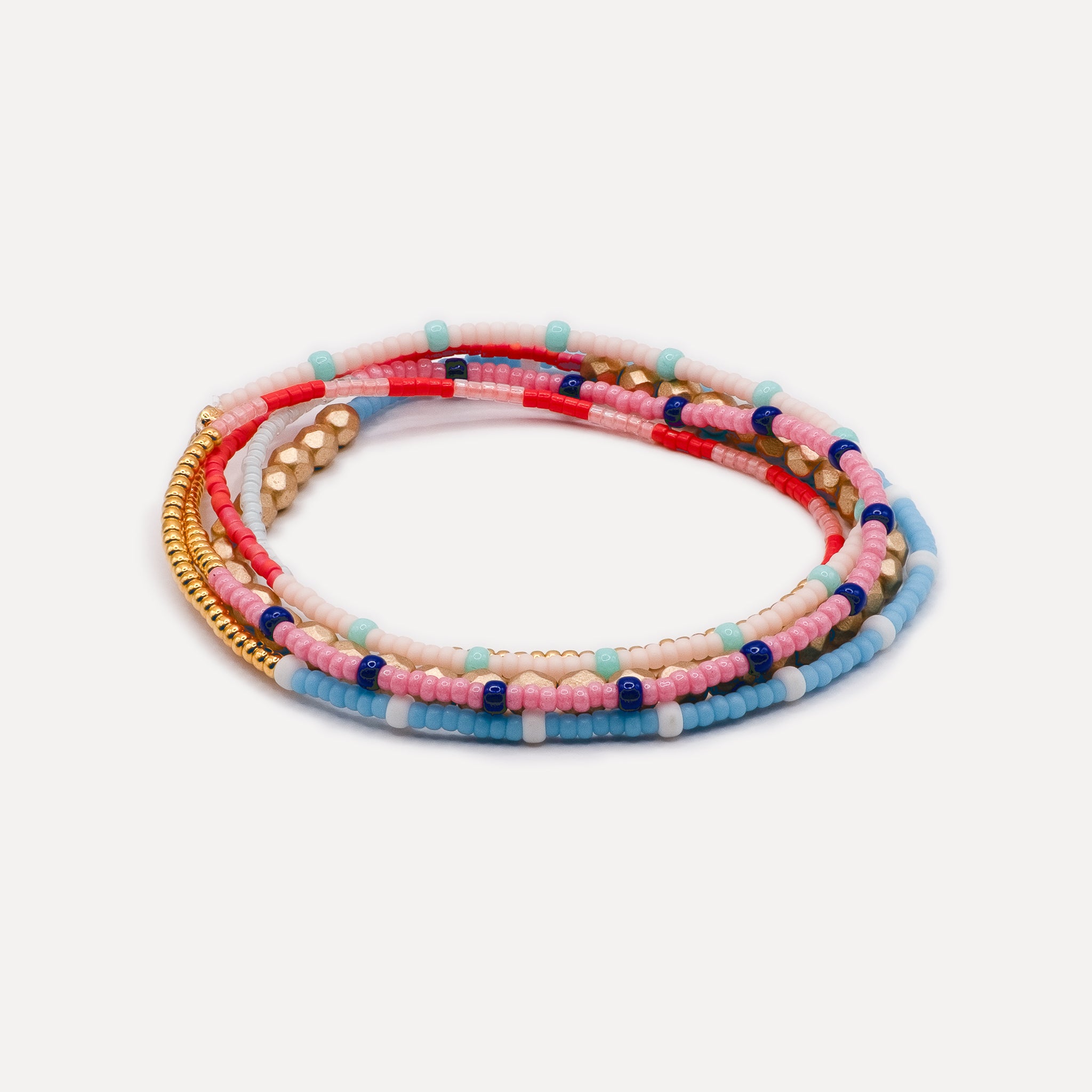 Our signature creation, the Malindi Twist, is a versatile design that can be styled as both a necklace and bracelet - twist it over the wrist five times or over the neck twice. An everyday, easy-to-wear piece. The Carnival Twist is thread with gold-plated fire-polished beads, Japanese miyuki glass delica, and Czech seed beads. Designed to be layered with other pieces from our collection, or with your existing jewellery. Dress up or down.