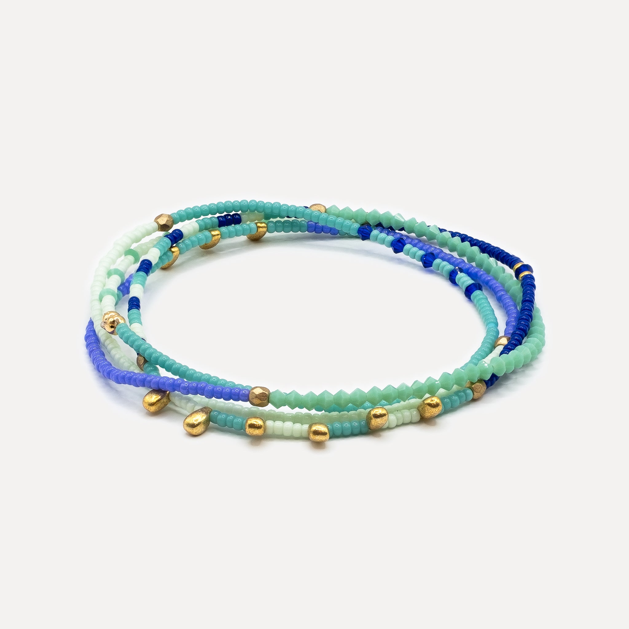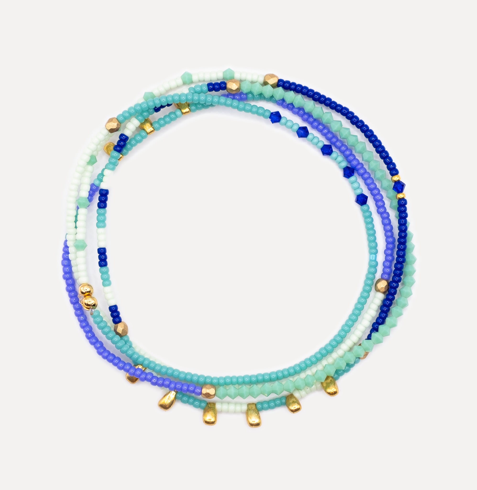 Our signature creation, the Malindi Twist, is a versatile design that can be styled as both a necklace and bracelet - twist it over the wrist five times or over the neck twice. An everyday, easy-to-wear piece. The Lagoon Twist is thread with gold-plated drop beads, Czech preciosa gems, and Japanese miyuki glass seed beads. Designed to be layered with other pieces from our collection, or with your existing jewellery. Dress up or down.