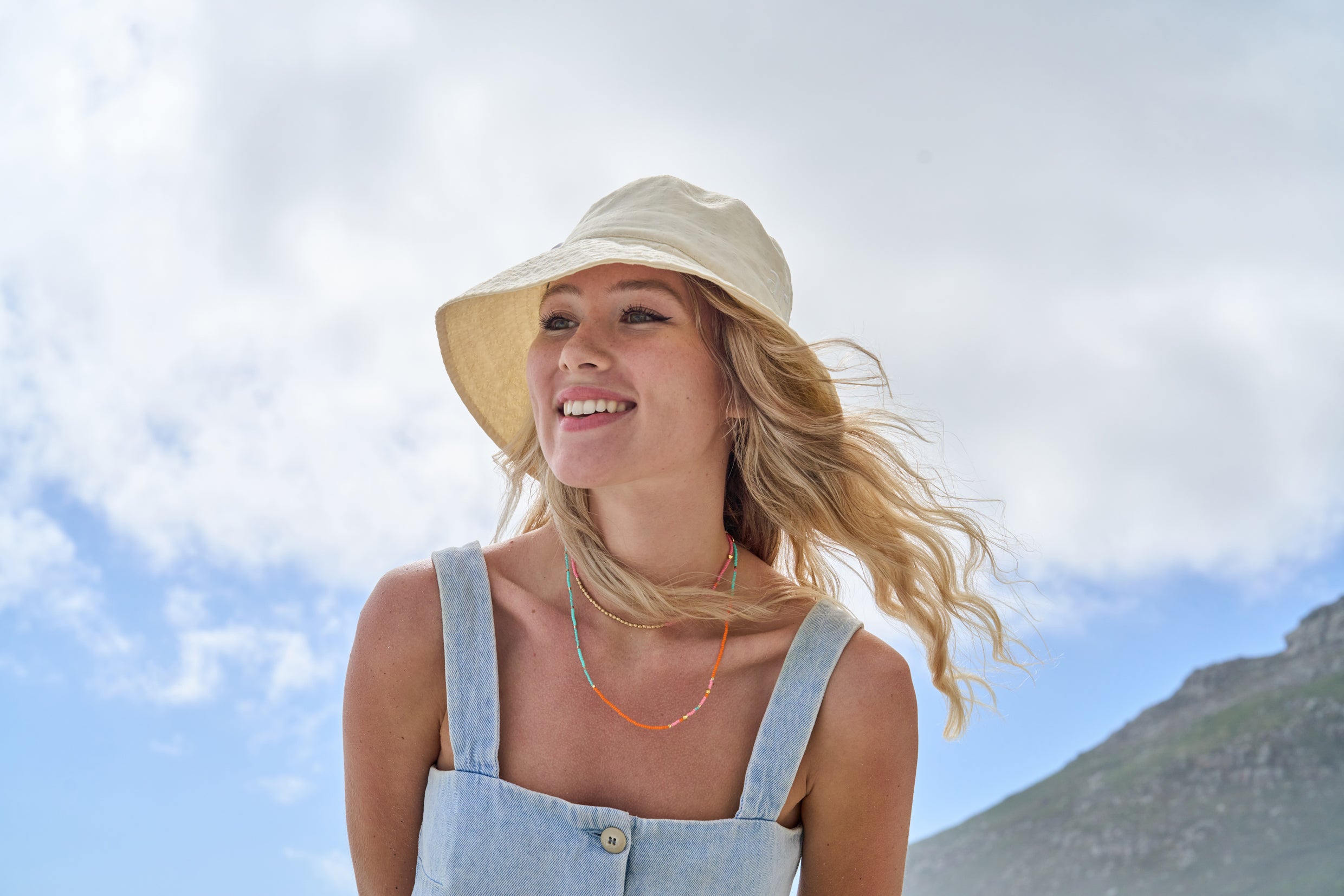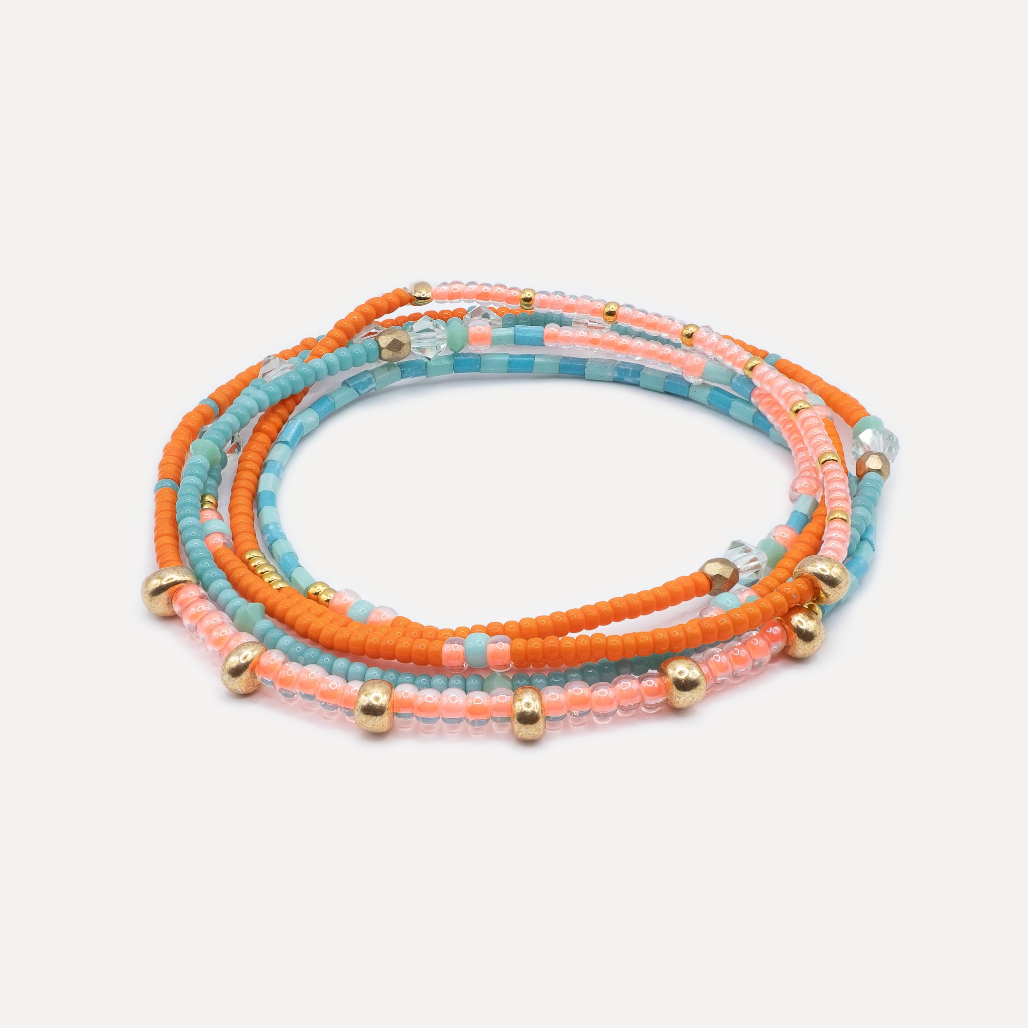 Our signature creation, the Malindi Twist, is a versatile design that can be styled as both a necklace and bracelet - twist it over the wrist five times or over the neck twice. An everyday, easy-to-wear piece. The Papaya Twist is thread with gold-plated drop beads, Czech preciosa gems, and Japanese miyuki glass seed beads. Designed to be layered with other pieces from our collection, or with your existing jewellery. Dress up or down.