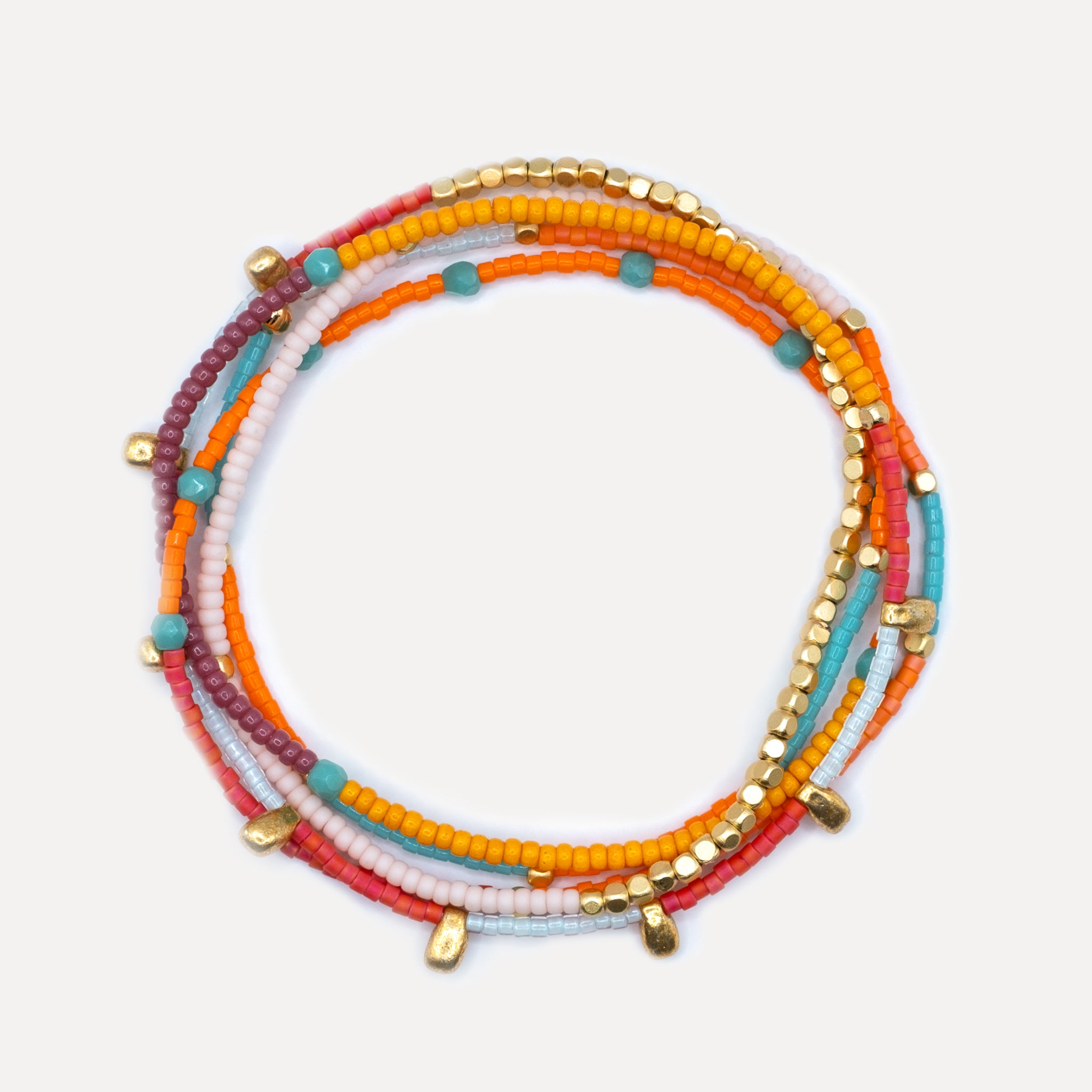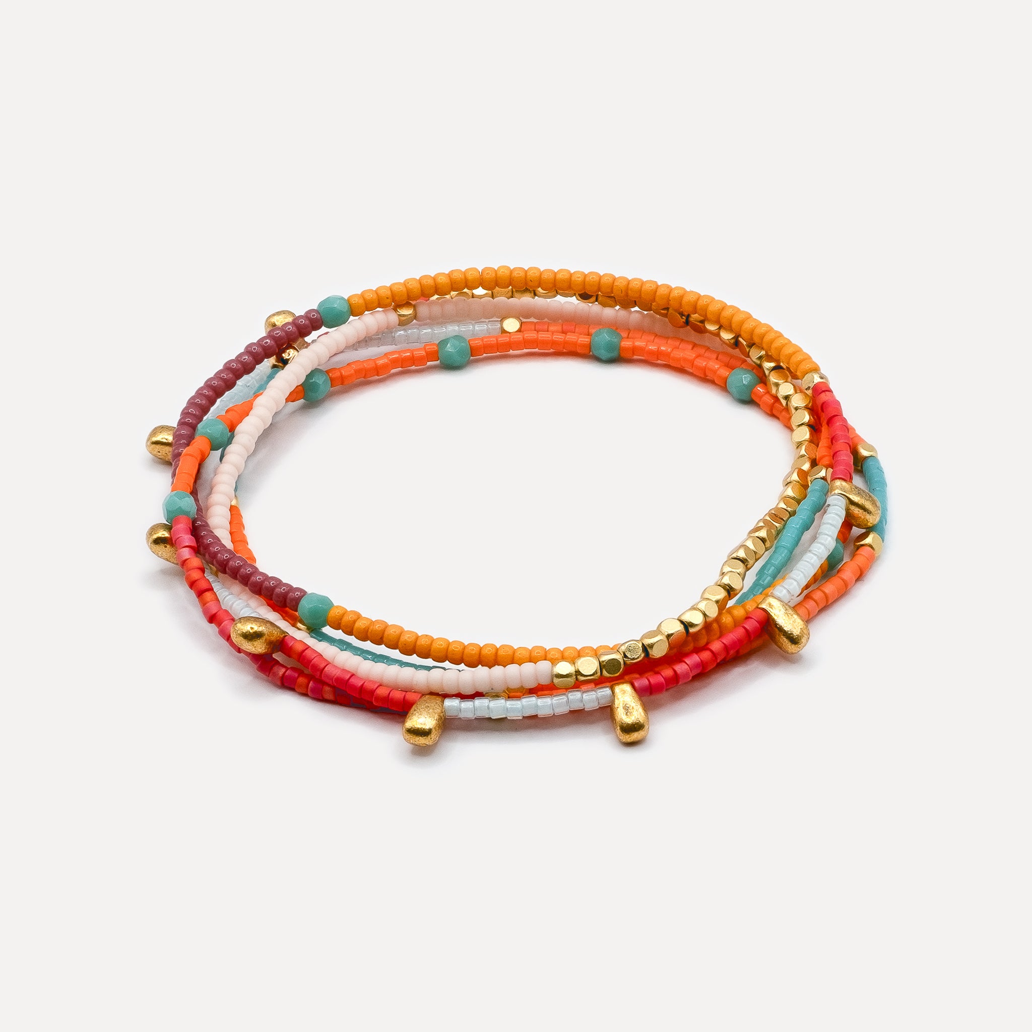 Our signature creation, the Malindi Twist, is a versatile design that can be styled as both a necklace and bracelet - twist it over the wrist five times or over the neck twice. An everyday, easy-to-wear piece. The Sahara Twist is thread with gold-plated drop beads, Czech preciosa gems, and Japanese miyuki glass seed beads. Designed to be layered with other pieces from our collection, or with your existing jewellery. Dress up or down.