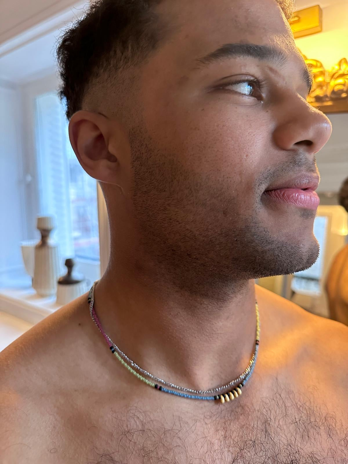 Using the finest quality materials this piece is handmade with gold-plated drop beads, and Japanese miyuki glass seed beads, thread onto durable soft-flex and finished with an 18k gold-plated clasp.