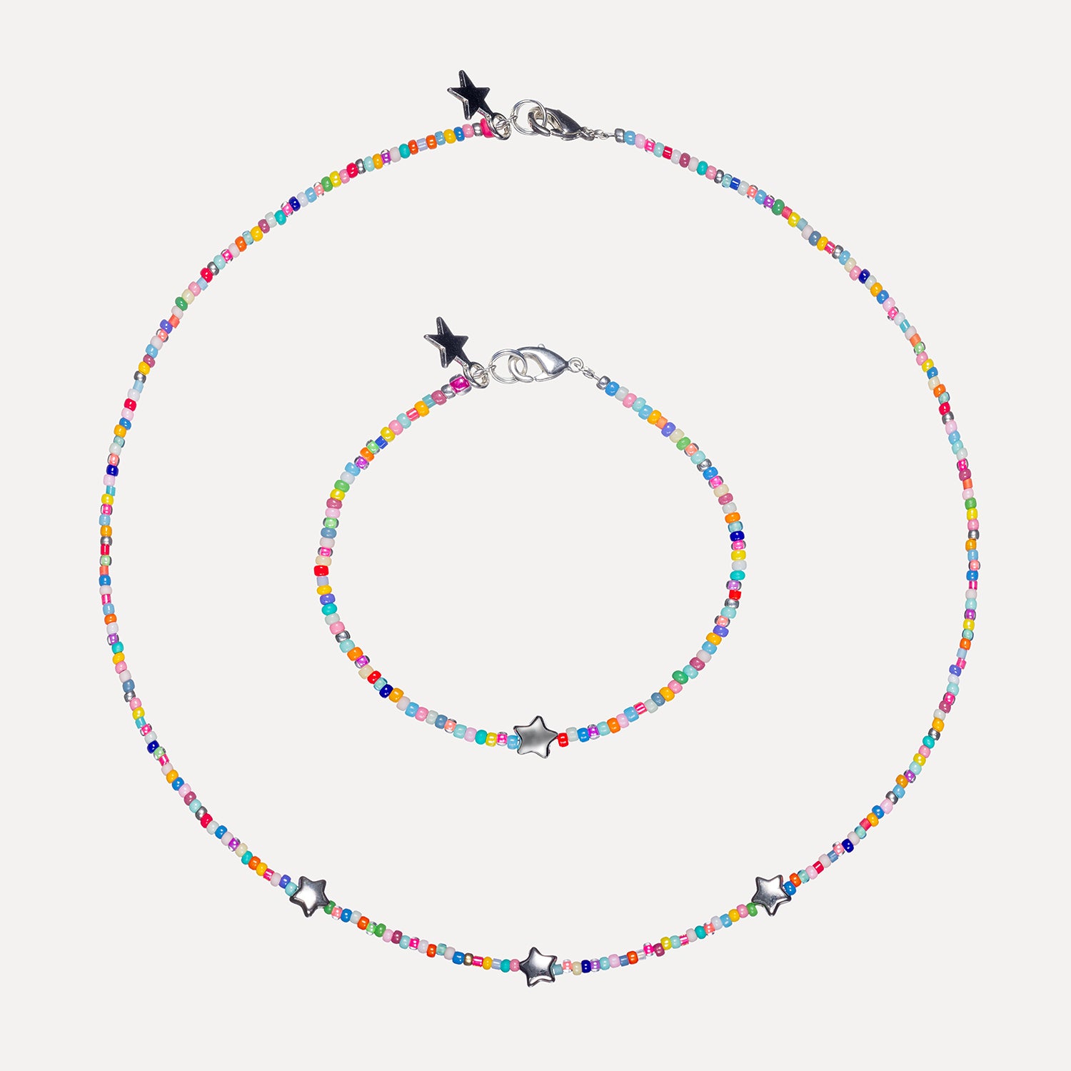 Using the finest quality materials this necklace & bracelet set is handmade with silver-plated stars, Japanese miyuki silver-plated seed beads, and Czech glass seed & delica beads, thread onto durable soft-flex and finished with a silver-plated clasp. This set is designed to be layered with other pieces from our collection, and with your existing jewellery. Dress up or down for an elevated, everyday look.