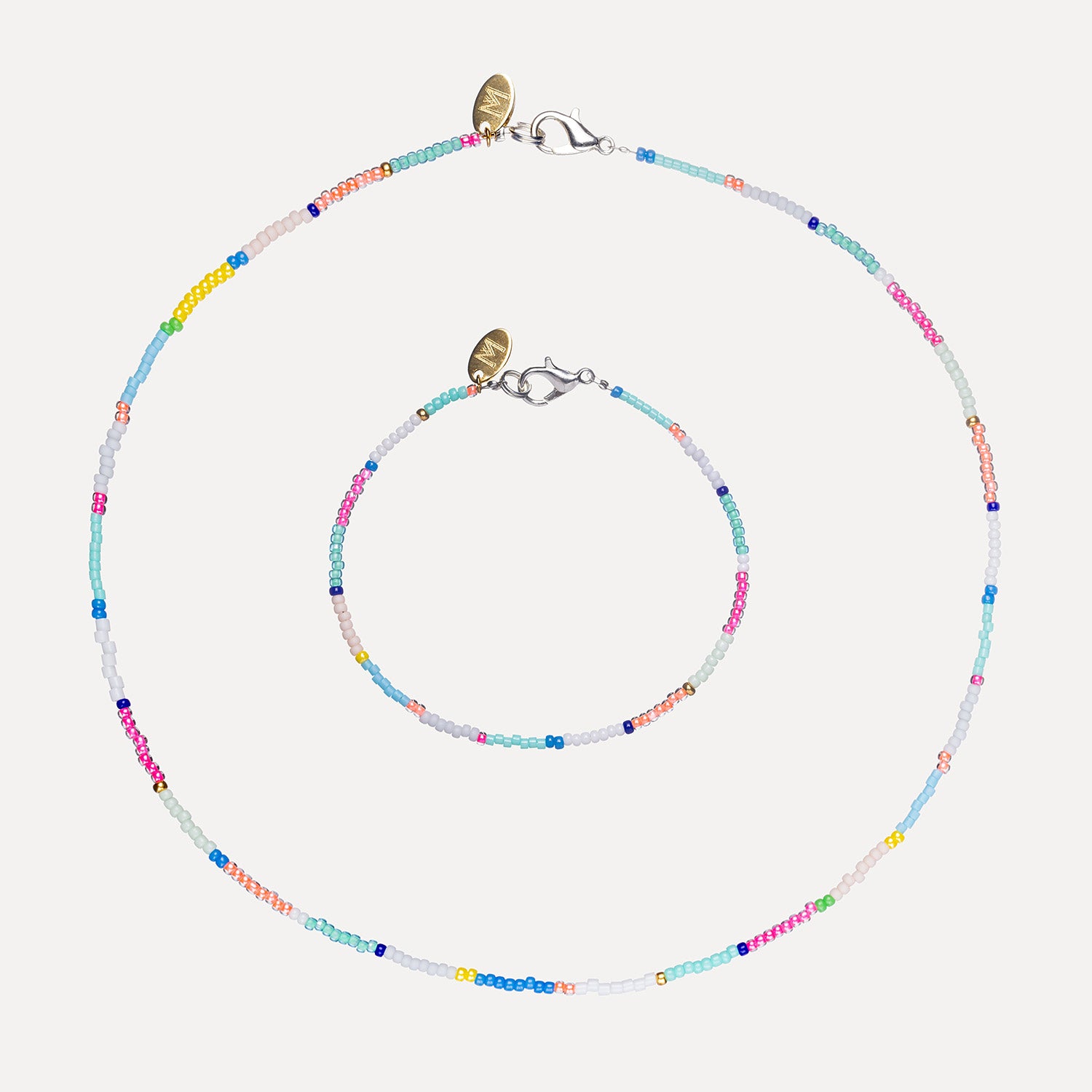 Using the finest quality materials this necklace & bracelet set is handmade with Japanese miyuki seed, and Czech glass beads, thread onto durable soft-flex and finished with a silver-plated clasp. This set is designed to be layered with other pieces from our collection, and with your existing jewellery. Dress up or down for an elevated, everyday look.
