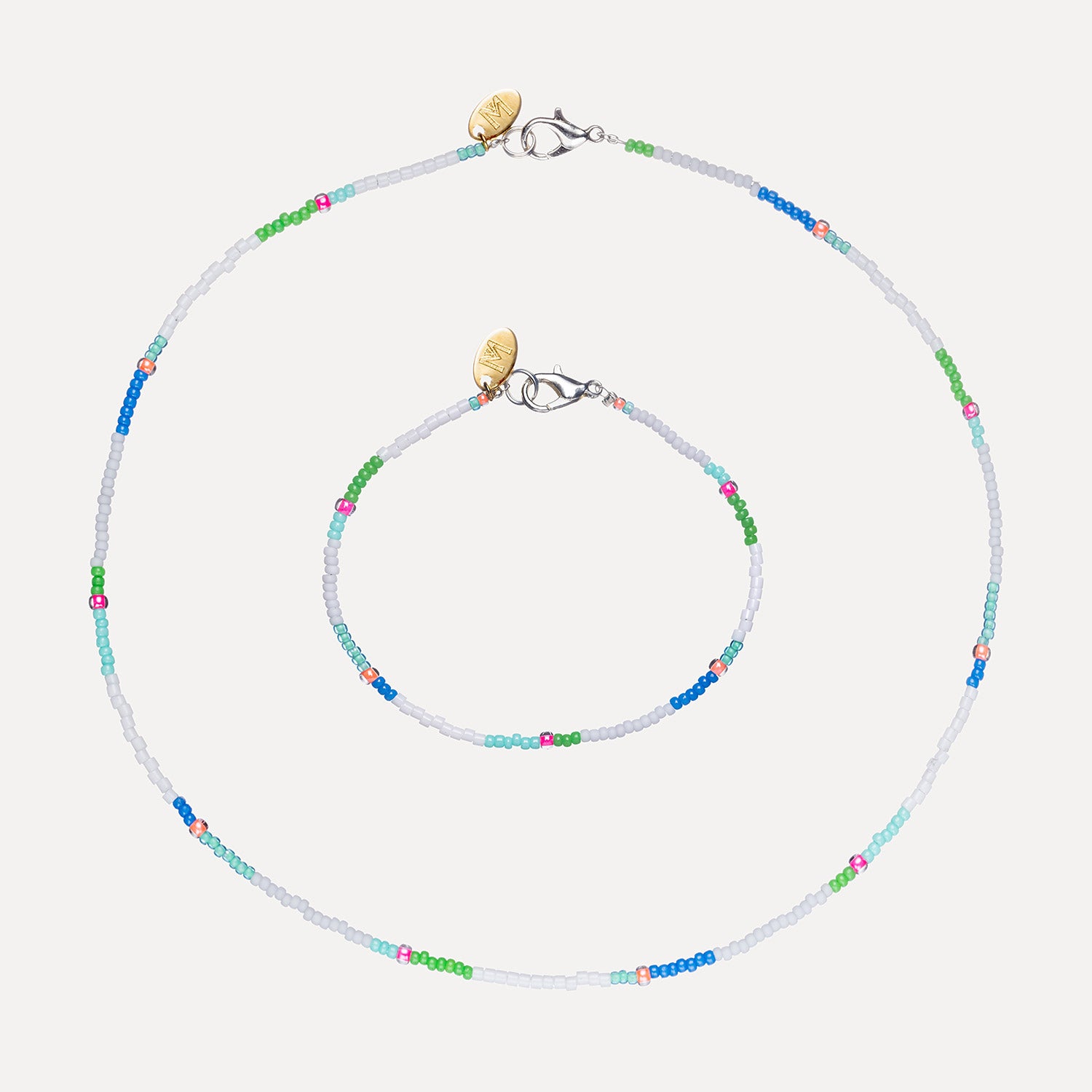 Using the finest quality materials this necklace & bracelet set is handmade with Japanese miyuki seed, and Czech glass beads, thread onto durable soft-flex and finished with a silver-plated clasp. This set is designed to be layered with other pieces from our collection, and with your existing jewellery. Dress up or down for an elevated, everyday look.