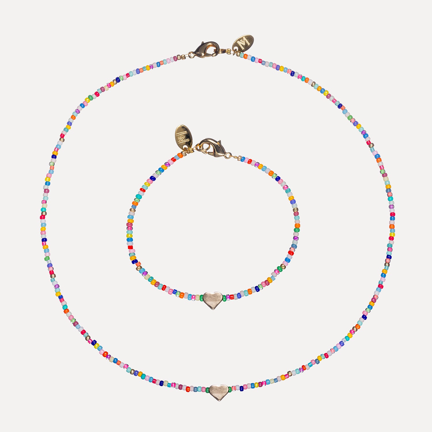 Using the finest quality materials this necklace & bracelet set is handmade with 14K gold-plated hearts, Japanese miyuki gold-plated seed beads, and Czech glass seed & delica beads, thread onto durable soft-flex, finished with an 18k gold-filled clasp. This set can be layered with other pieces from our collection and with your existing jewellery. Dress up or down for an elevated, everyday look.