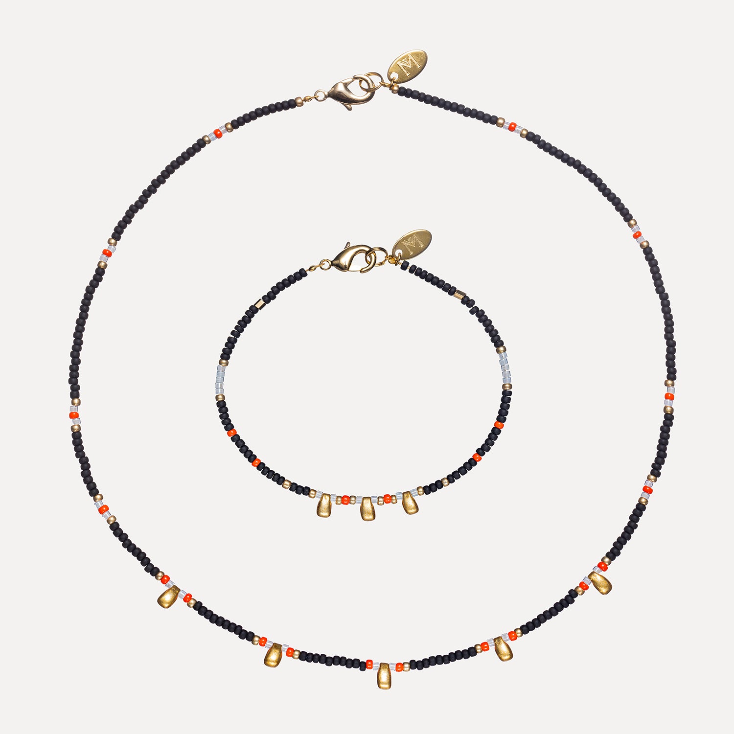 Using the finest quality materials this necklace & bracelet set is handmade with Japanese gold-plated miyuki drop, and Czech glass seed beads, and preciosa gems, thread onto durable soft-flex and finished with an 18k gold-filled clasp. This set is designed to be layered with other pieces from our collection, and with your existing jewellery. Dress up or down for an elevated, everyday look.