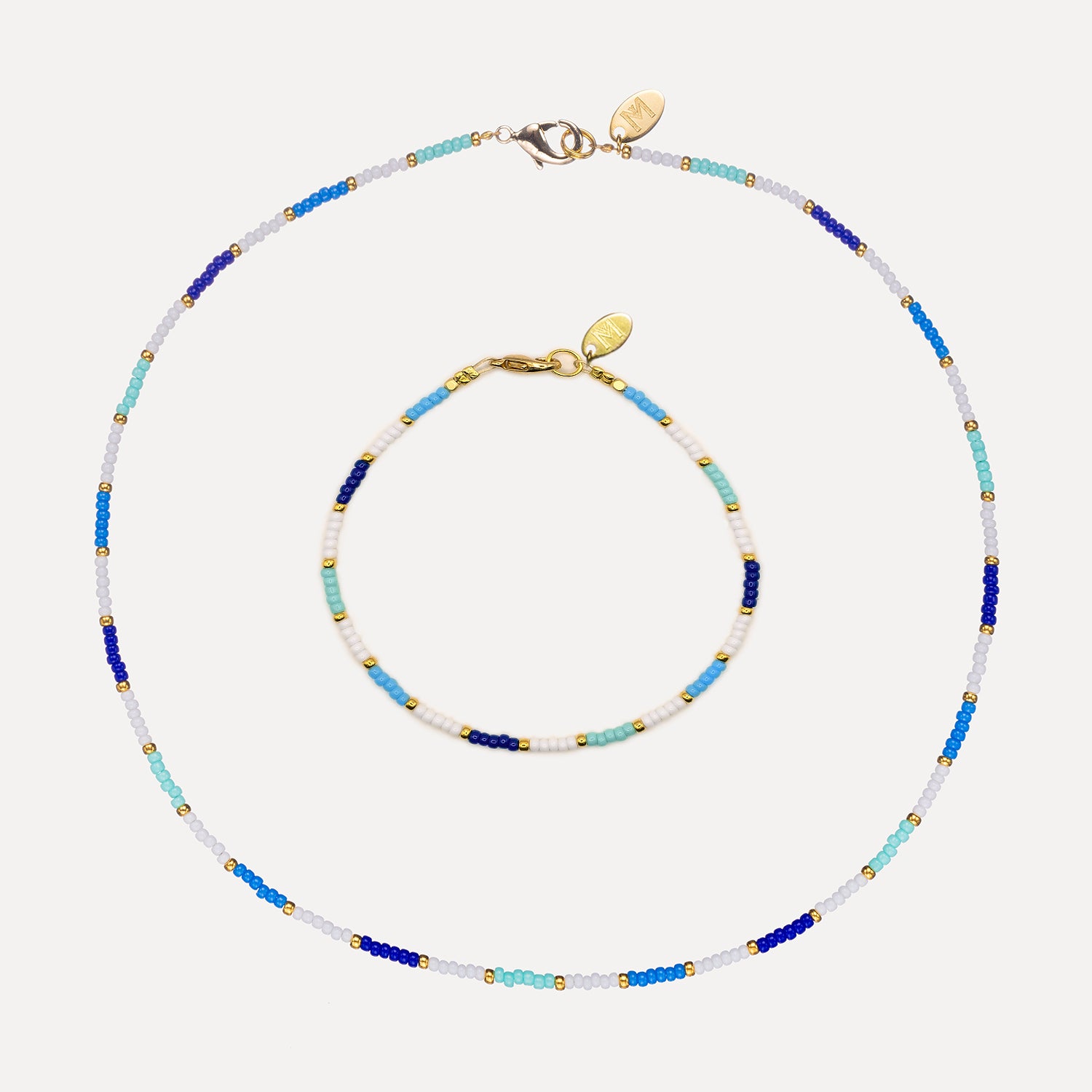 Using the finest quality materials this necklace & bracelet set is handmade with Japanese gold-plated miyuki beads, and Czech glass seed beads, thread onto durable soft-flex and finished with an 18k gold-filled clasp. This set is designed to be layered with other pieces from our collection, and with your existing jewellery. Dress up or down for an elevated, everyday look.