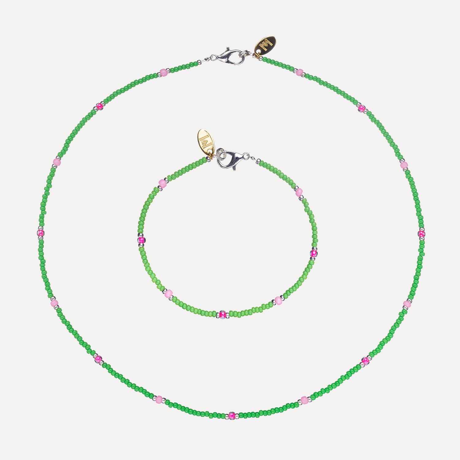 Using the finest quality materials this necklace & bracelet set is handmade with silver-plated miyuki beads, and Czech glass seed beads, thread onto durable soft-flex and finished with an 18k gold-filled clasp. This set is designed to be layered with other pieces from our collection, and with your existing jewellery. Dress up or down for an elevated, everyday look.